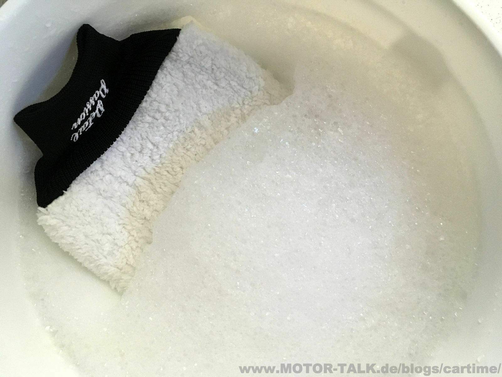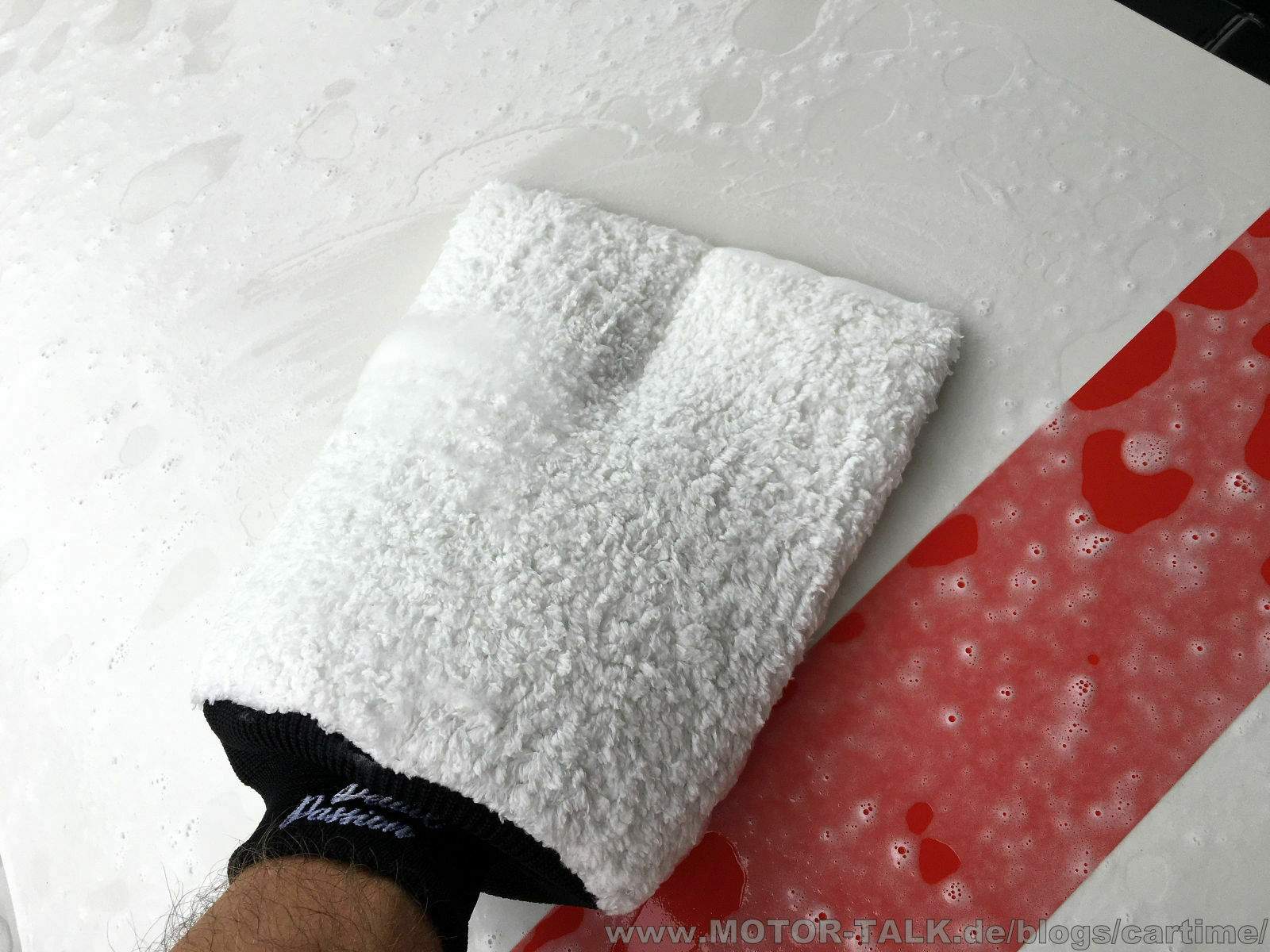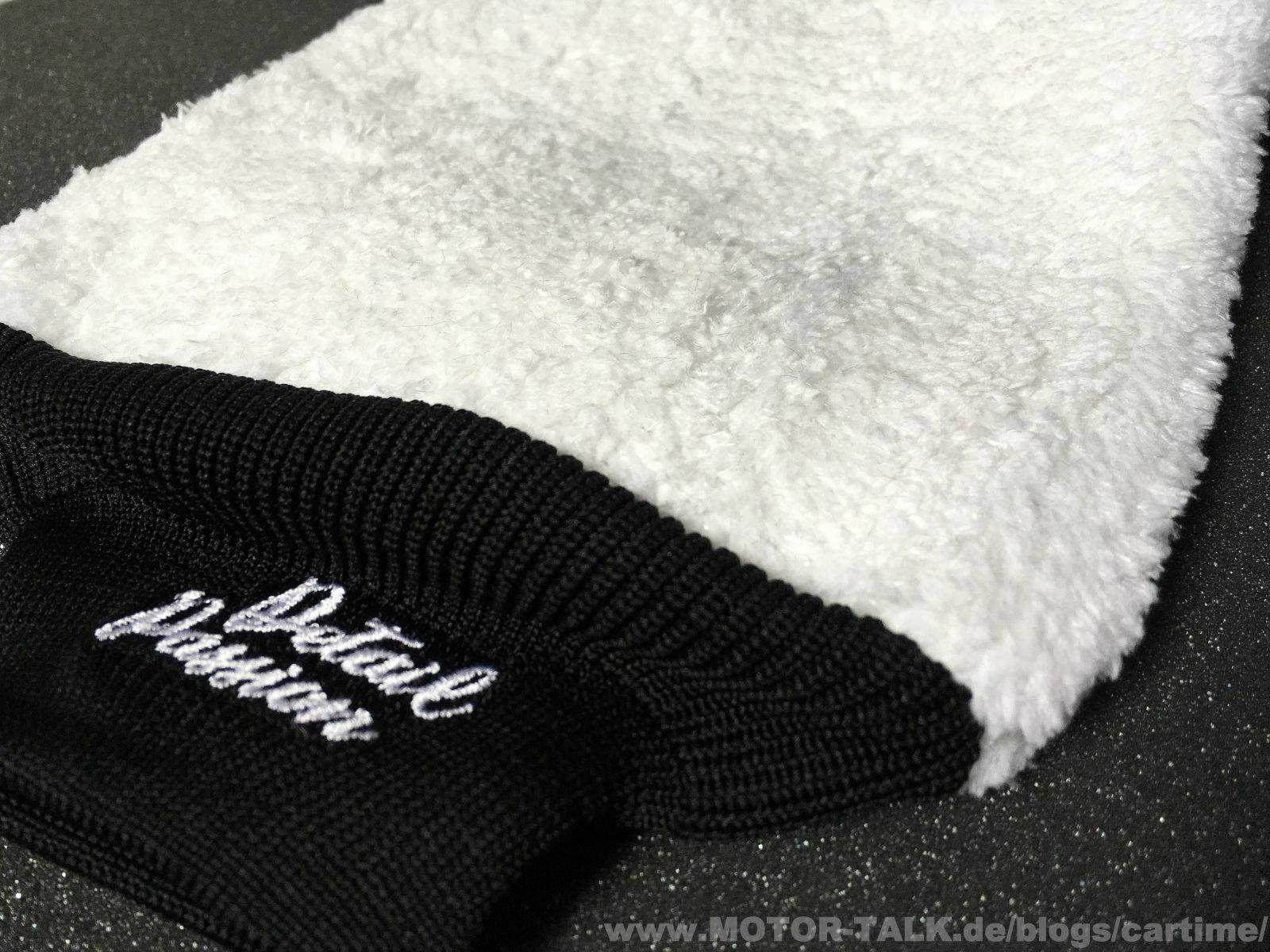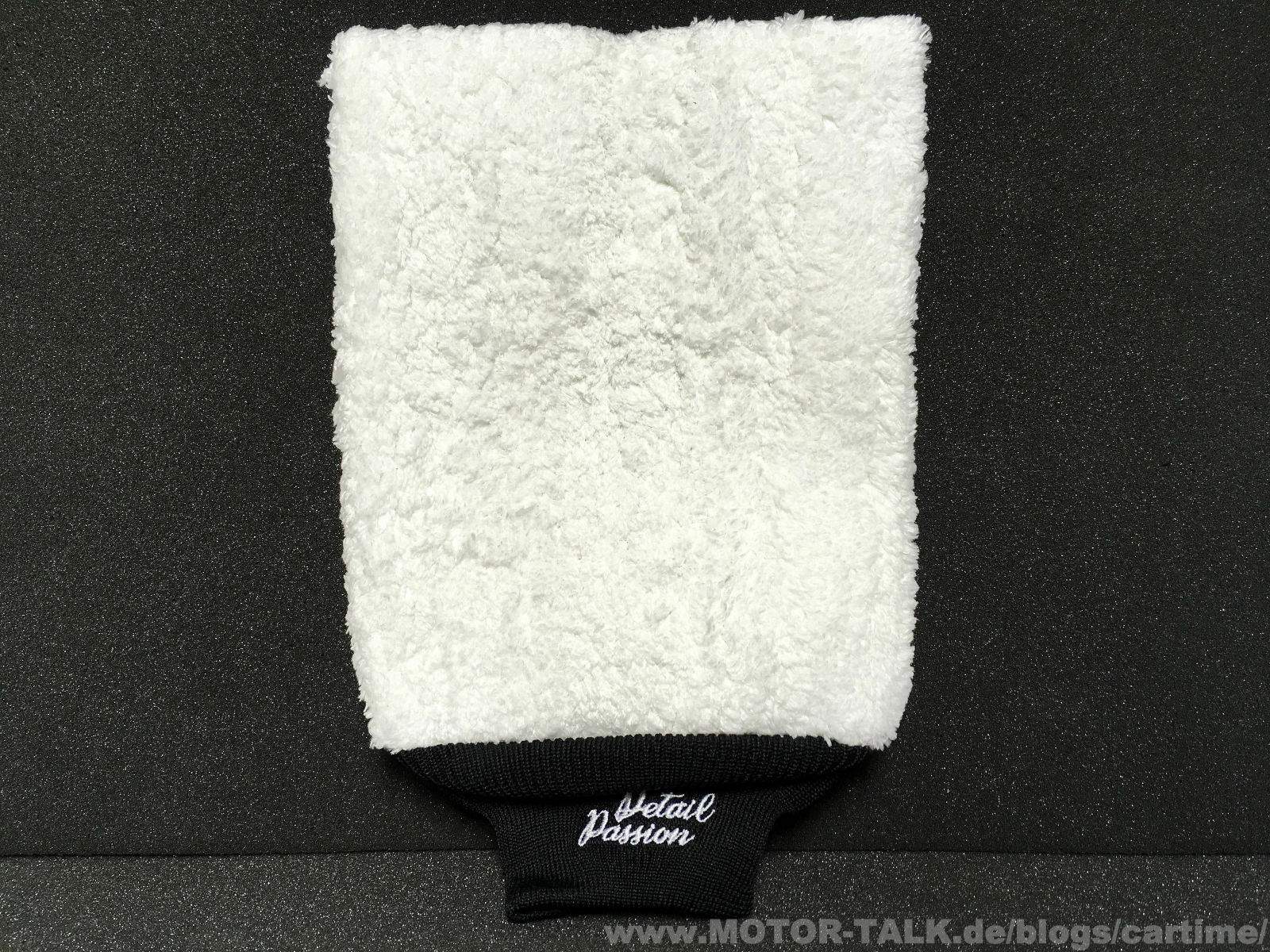 Der Waschhandschuh Paintwork-Lover (19x29 cm) erinnert etwas an den Meguiar‘s Waschhandschuh. Mit dem Unterschied, dass dieser ja bekanntlich sehr groß ist. Bei dem Modell von Detail Passion ist das nicht so, dort findet man auch innen guten Halt an der Innentrennung. Er ist ansonsten wie der Meg. auch eher dünn.