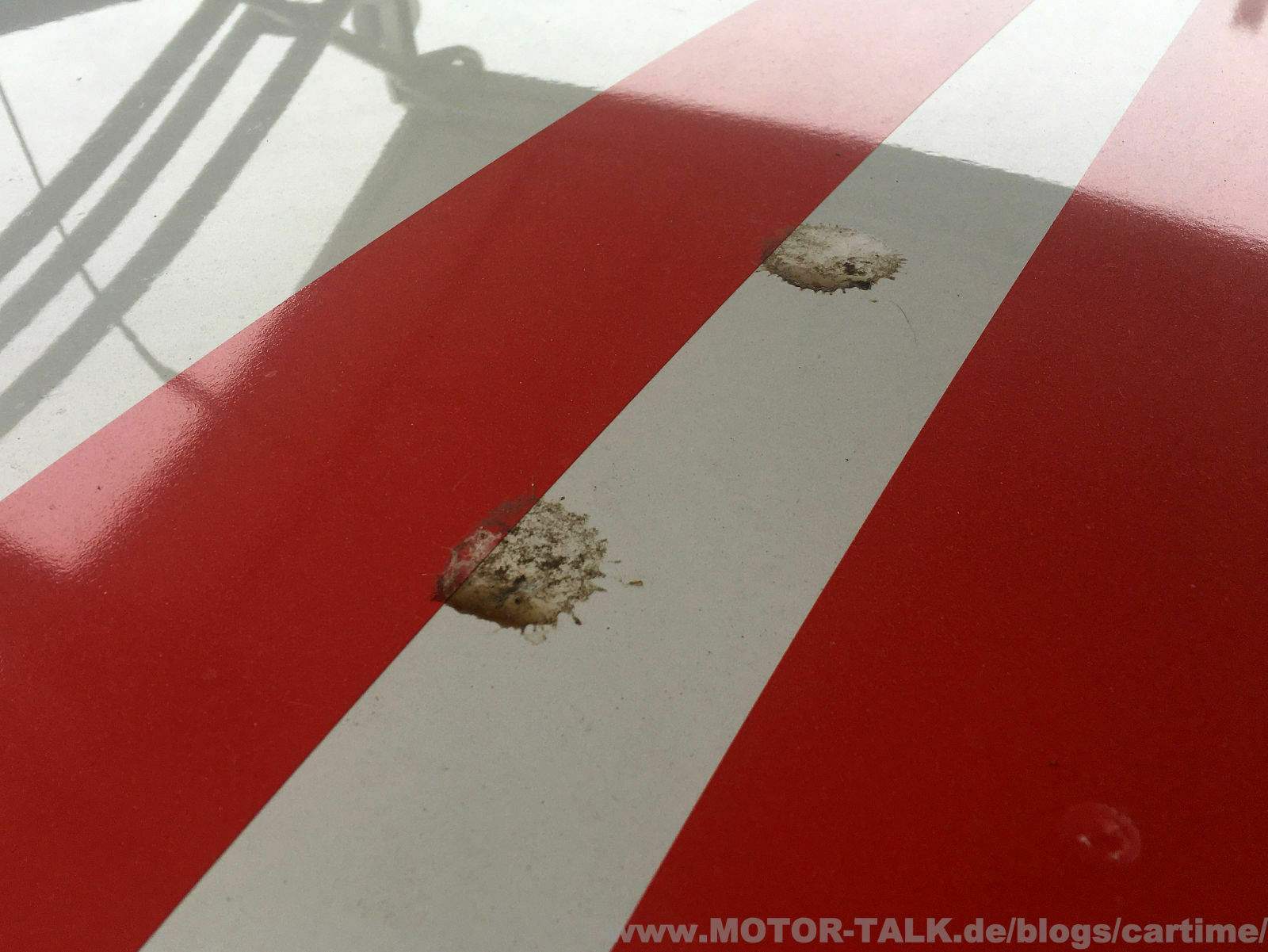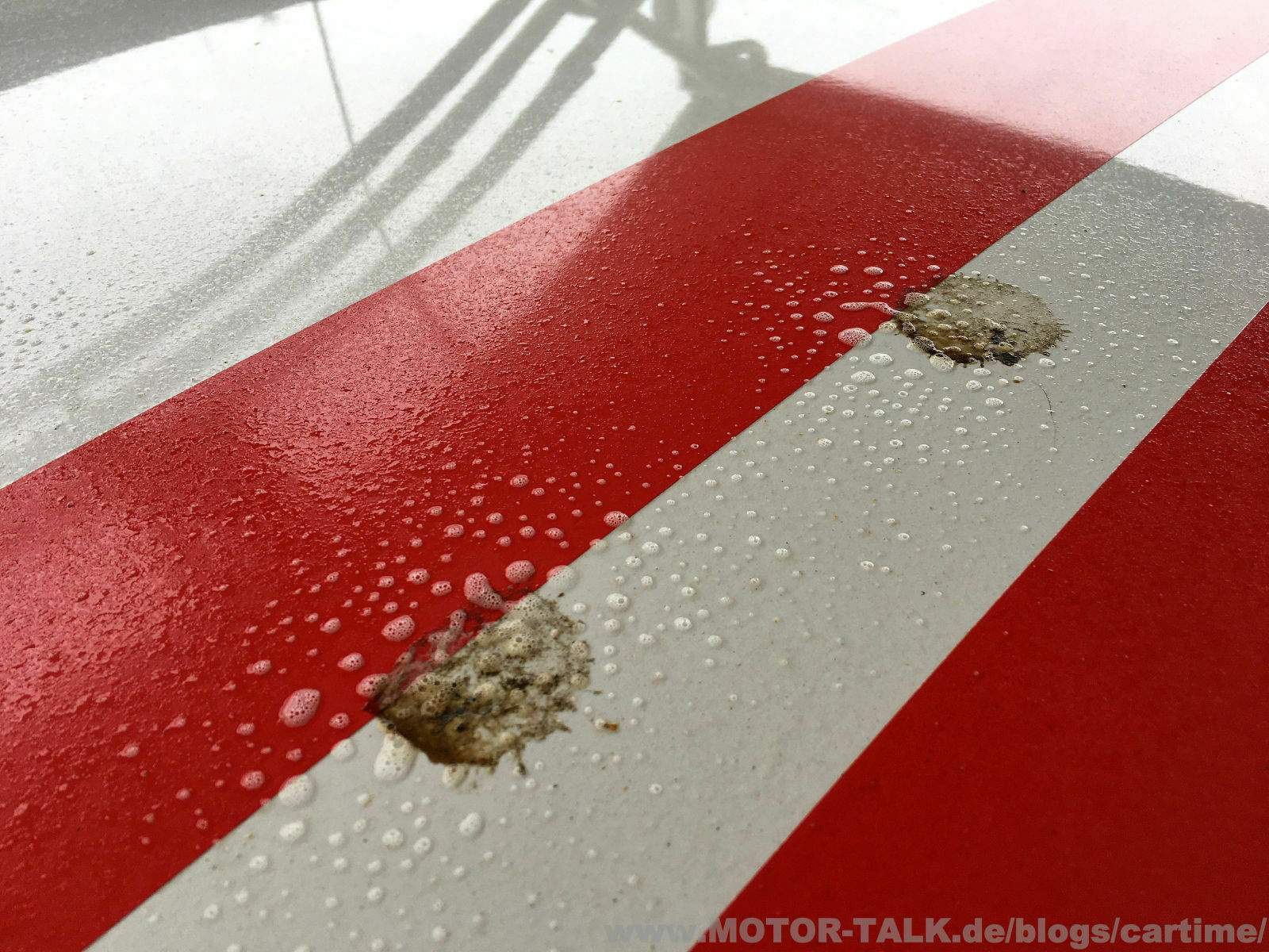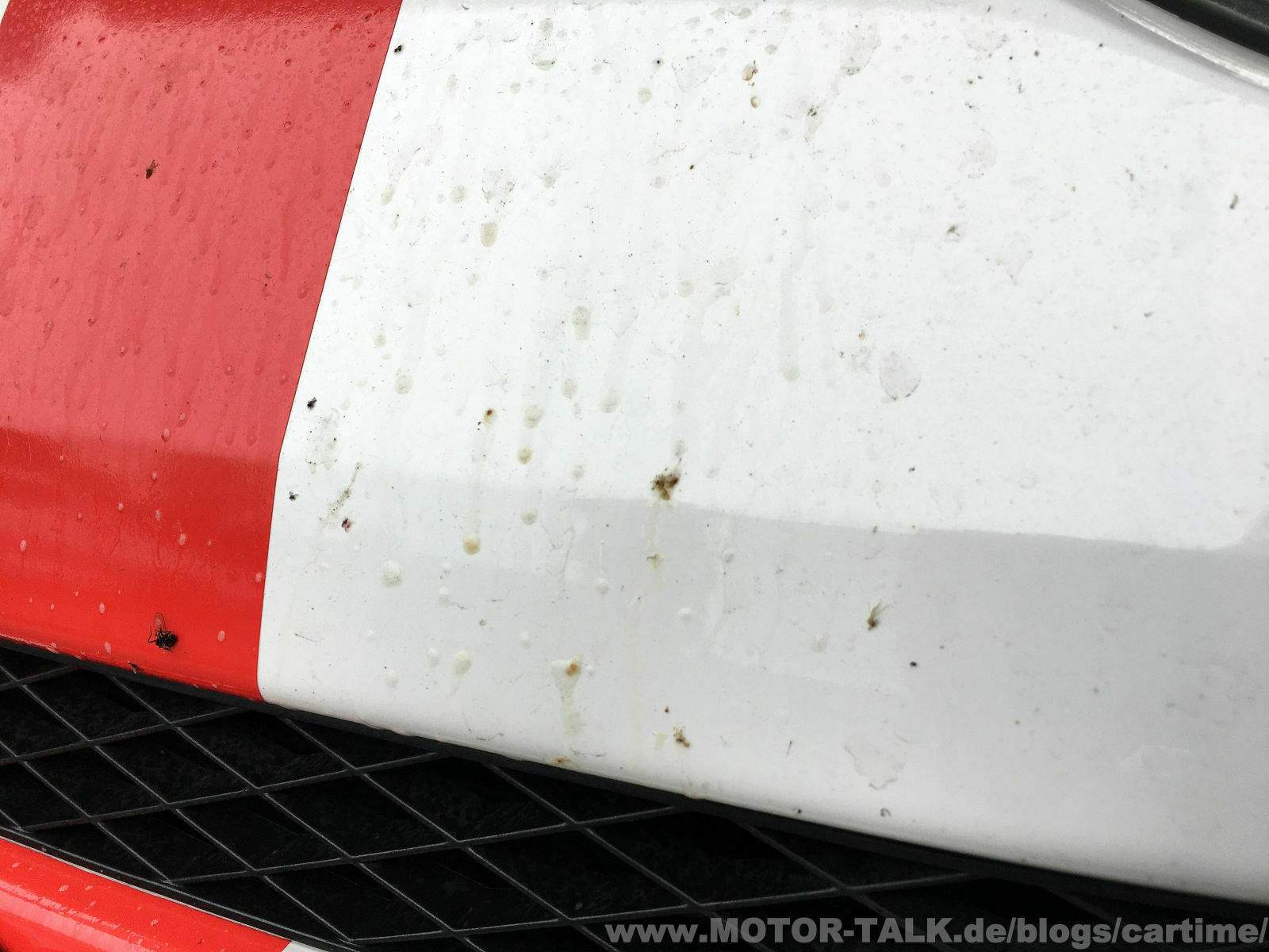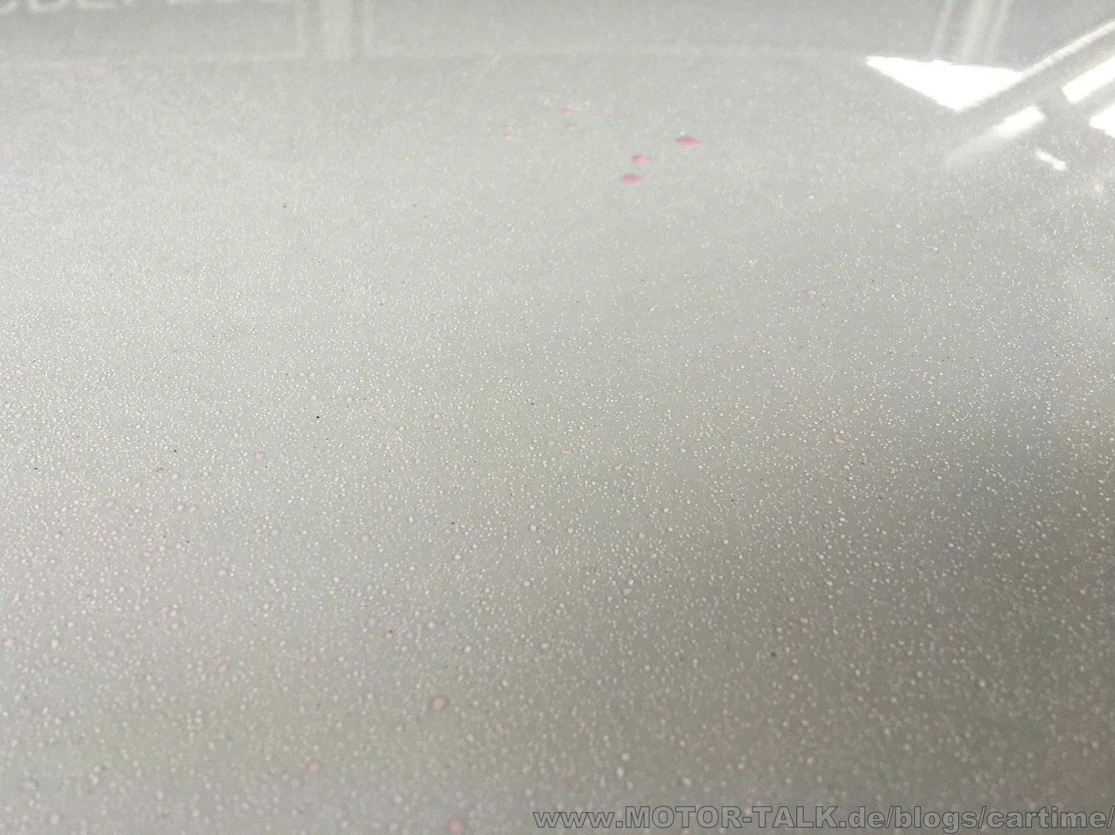 Die Ergebnisse können sich sehen lassen. Die Insekten sind fast alle abgegangen. Ein paar minimale und vereinzelte sind geblieben. Man muss bedenken, er stand in der Zeit auch öfters in der prallen Sonne. Das bekommen wir später mit dem Waschhandschuh weg. Hoffe ich doch. Die Vogelschisse sind auch weg. Jedoch schon leicht eingebrannt. Das braucht später evtl. mal milde Politur.