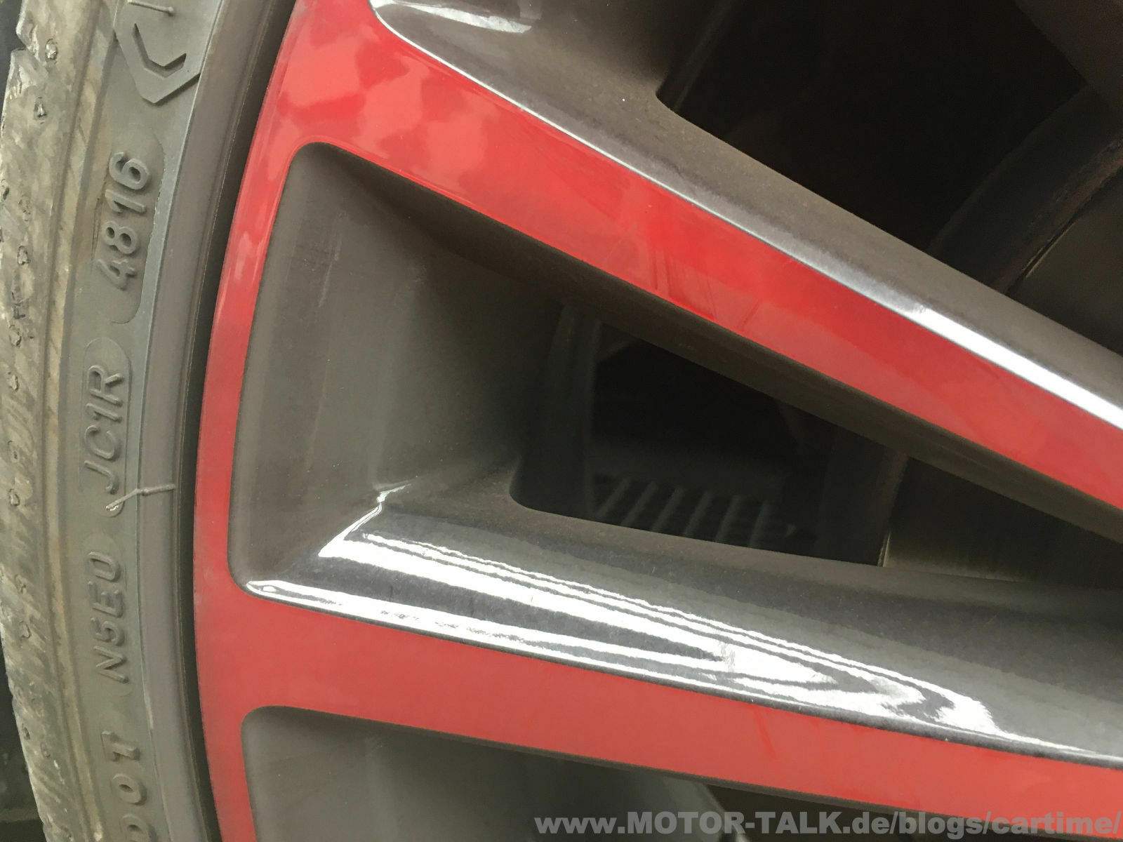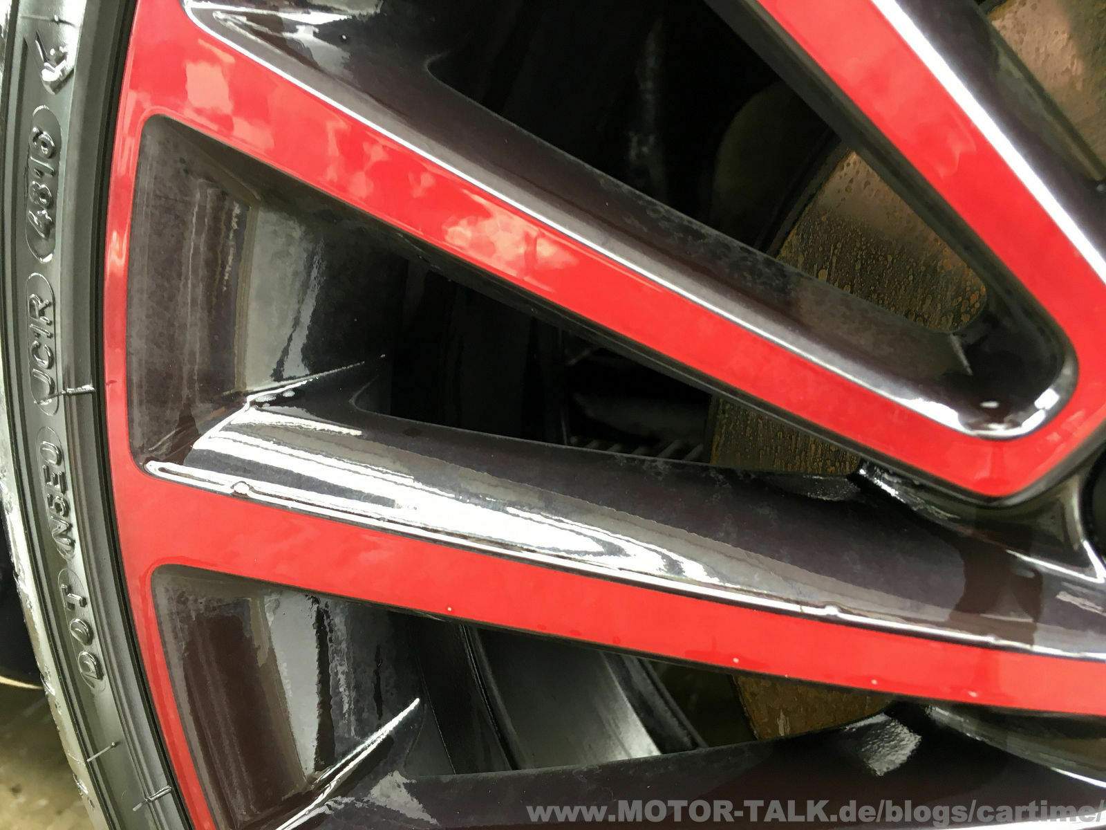 Die kontaktlose Felgenreinigung sieht auch gut aus. Auf den ersten Blick, auf den zweiten benötigt es mechanische Einwirkung wie ein Waschhandschuh oder eine Felgenbürste. Das ist prinzipiell ja immer so. Dann bekommt man wirklich perfekte Ergebnisse hin. Denn wirklich flächendeckend zu sprühen ist etwas tricky. Gerade auf schwarz, wo man alles sieht und dazu bei diesem Felgendesign (mehrspeichig). Die Bereiche, wo wirklich flächendeckend Reiniger war sehen allerdings schon sehr gut aus.