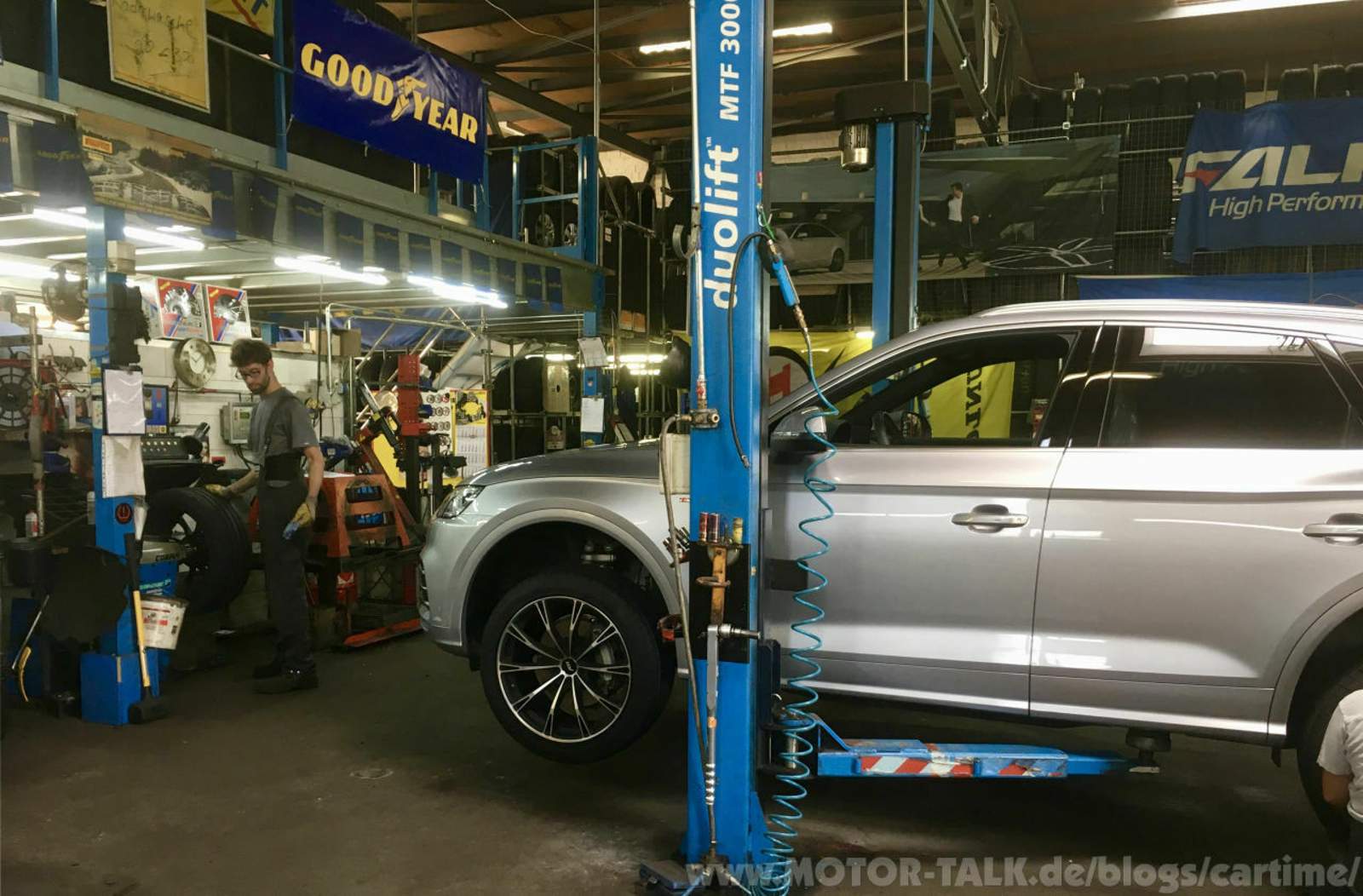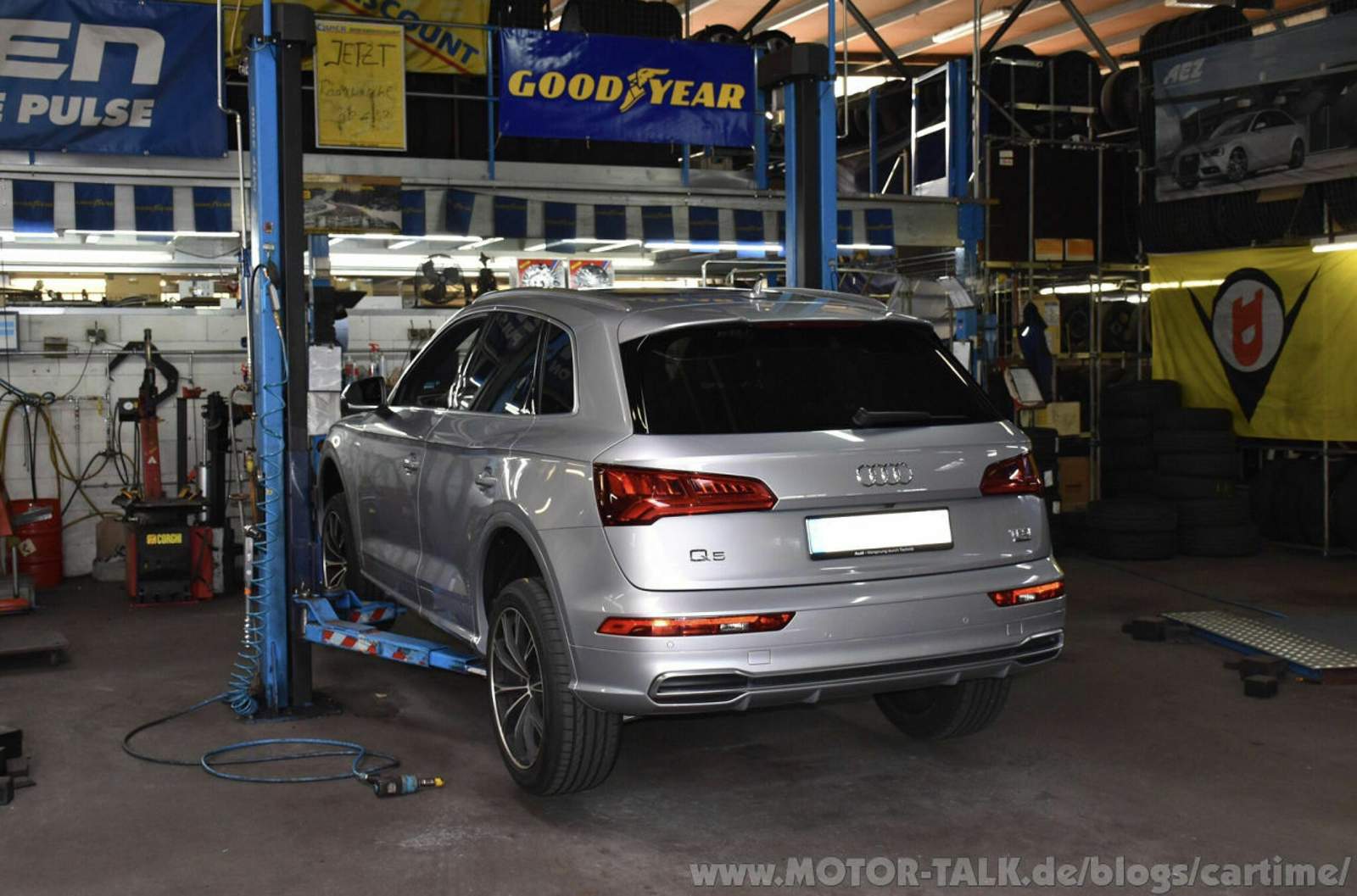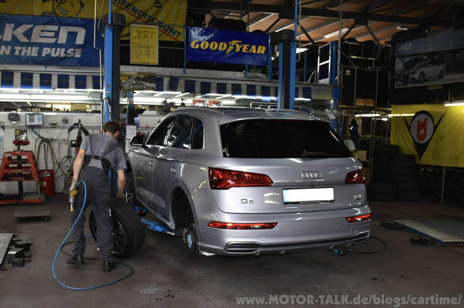 Im Warteraum gab es noch mehr Goodyearreifen zu sehen, u.a. den UltraGrip und den Vector 4Seasons. Ich ging ein paar Schritte weiter und es zischte es schon. Vor mir sah ich das Kälbchen schon auf der Hebebühne abheben. Daneben die frischen neuen Gummis in den Dimensionen 255/45 R20 105 W XL. Eigentlich braucht mein Q5 nur 101 W. Ein höherwertiger Lastindex ist jedoch kein Problem. Braucht dann, in meinem Fall, nur minimal mehr Luft.