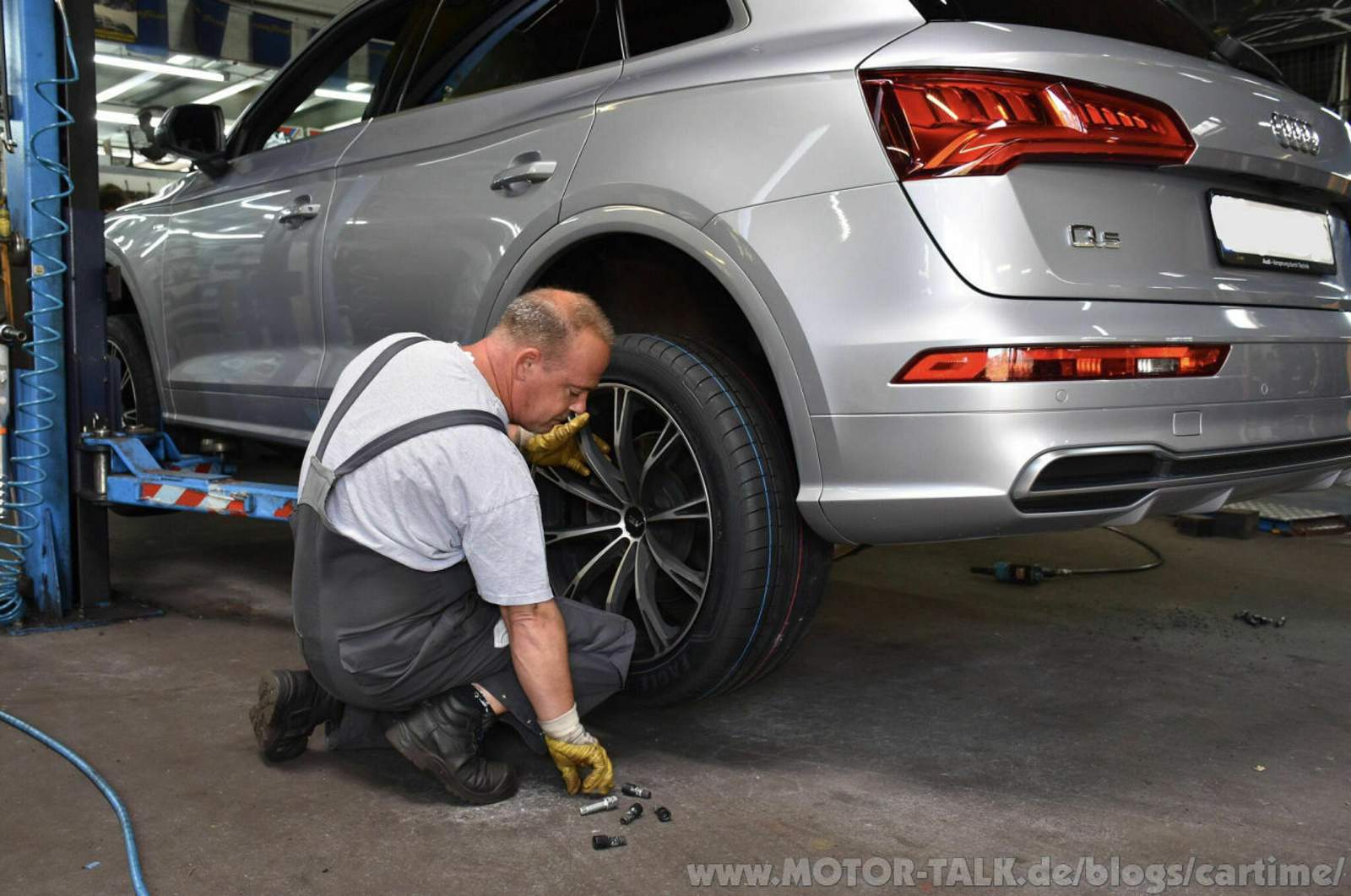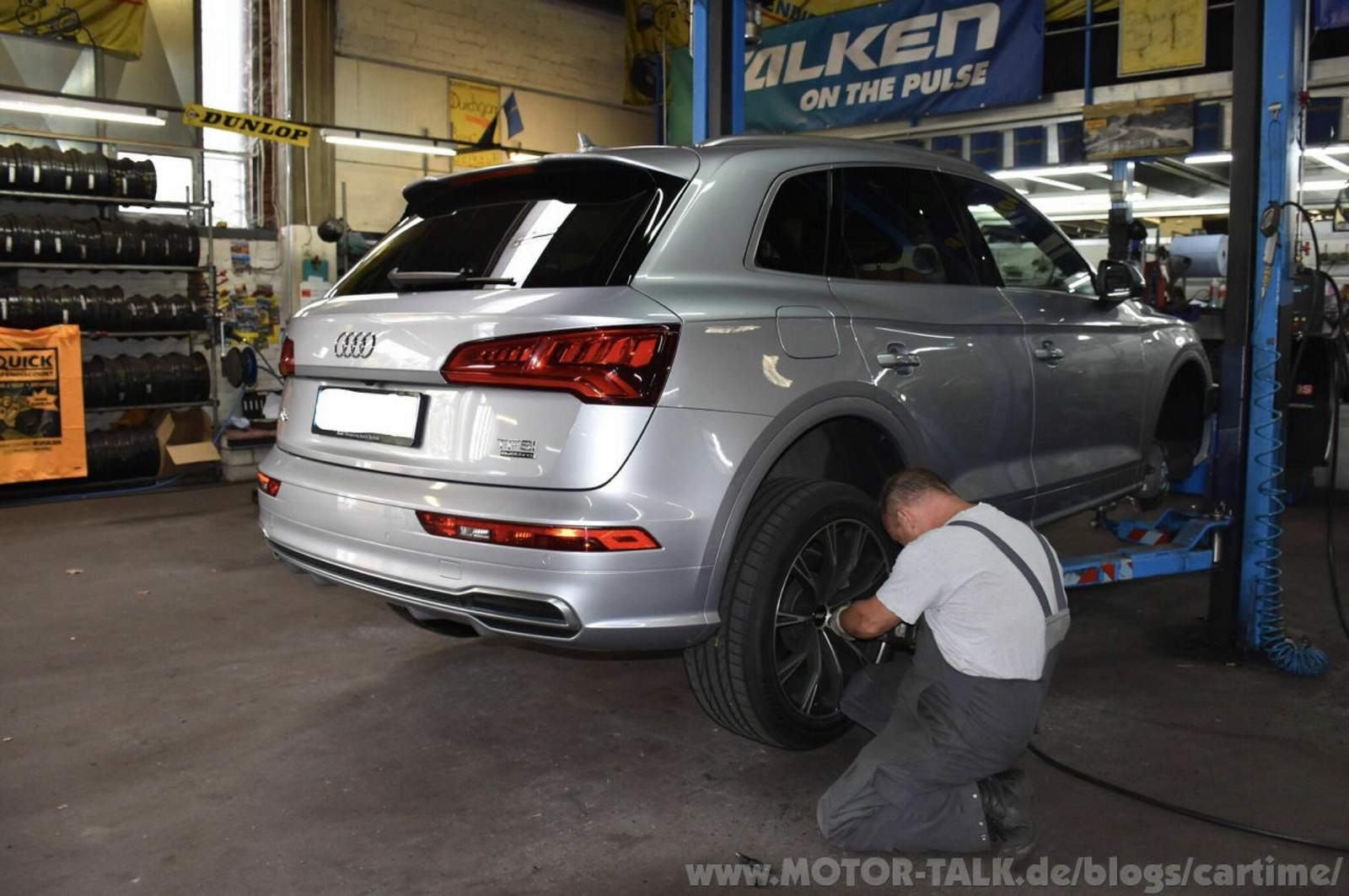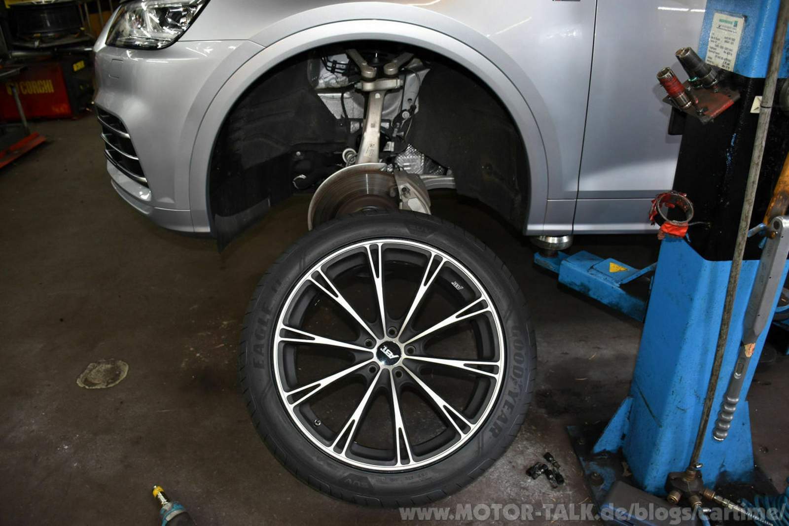 Im Warteraum gab es noch mehr Goodyearreifen zu sehen, u.a. den UltraGrip und den Vector 4Seasons. Ich ging ein paar Schritte weiter und es zischte es schon. Vor mir sah ich das Kälbchen schon auf der Hebebühne abheben. Daneben die frischen neuen Gummis in den Dimensionen 255/45 R20 105 W XL. Eigentlich braucht mein Q5 nur 101 W. Ein höherwertiger Lastindex ist jedoch kein Problem. Braucht dann, in meinem Fall, nur minimal mehr Luft.