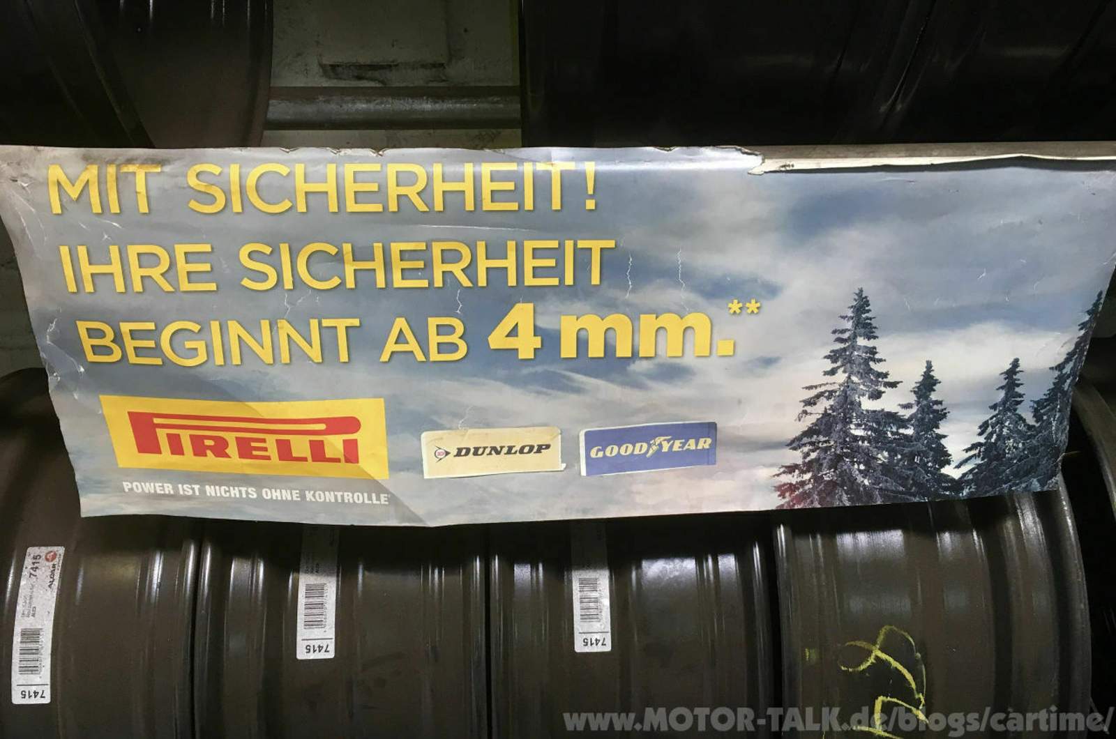 Weiter in der Werkstatthalle hing ein Plakat mit der Aufschrift „Mit Sicherheit - Ihre Sicherheit beginnt ab 4 mm“. Das gilt vorallem bei Winterreifen. Beträgt die Profiltiefe bei Sommerreifen weniger als 3/4 Milimeter ist es empfehlenswert sich neue Reifen zu besorgen. Die gesetzlich vorgeschriebene Mindestprofiltiefe beträgt 1,6 Milimeter. Man wird es irgendwann auch selber beim Fahrverhalten merken. Der Reifen hat dann nicht mehr den nötigen Grip und bietet somit nicht mehr das Plus an Sicherheit. Auch wenn Reifen noch die nötigen Mindestprofiltiefen haben oder sogar mehr, dafür aber schon über 8 Jahre alt, wird es Zeit für neue Pneus.