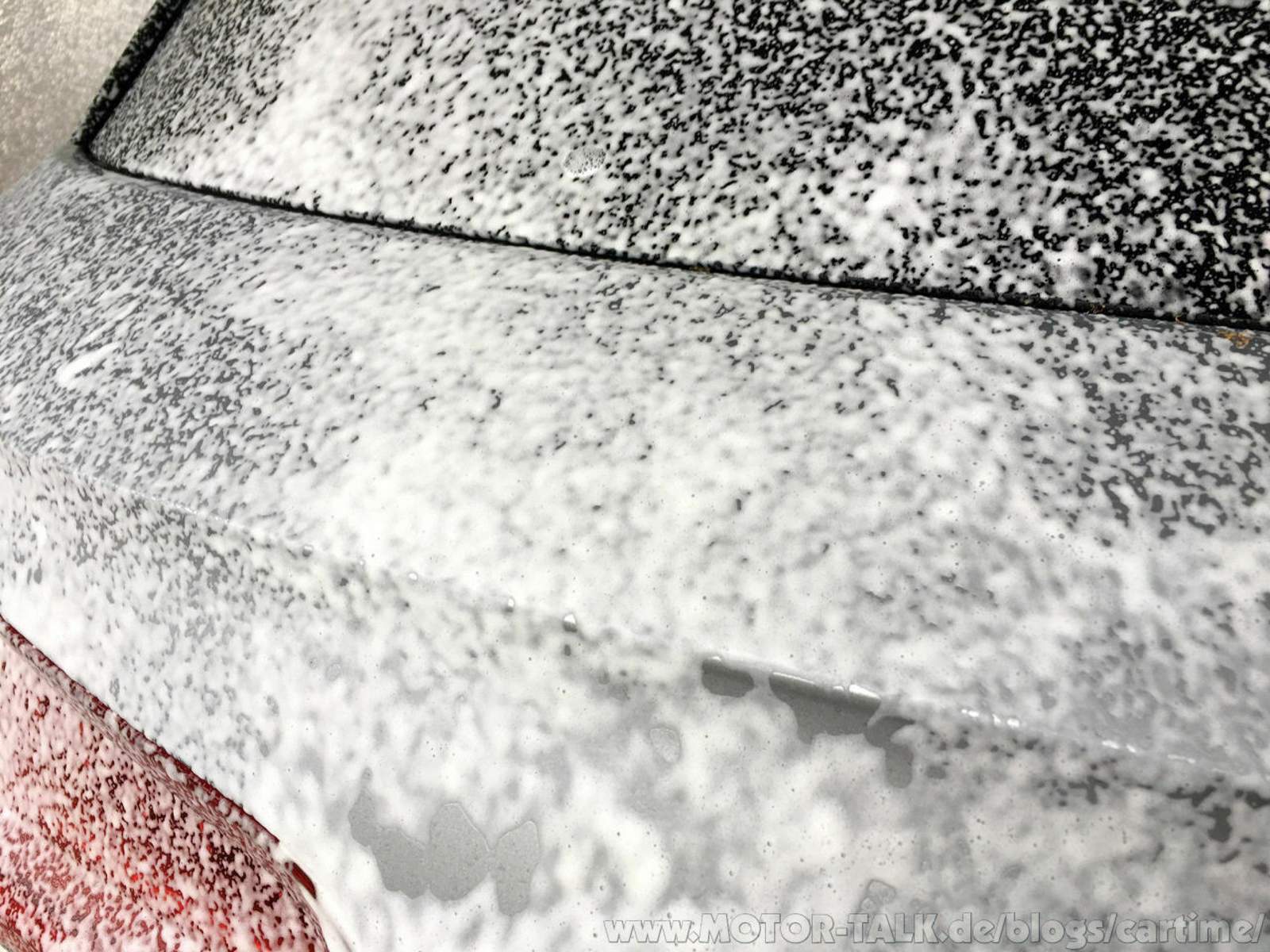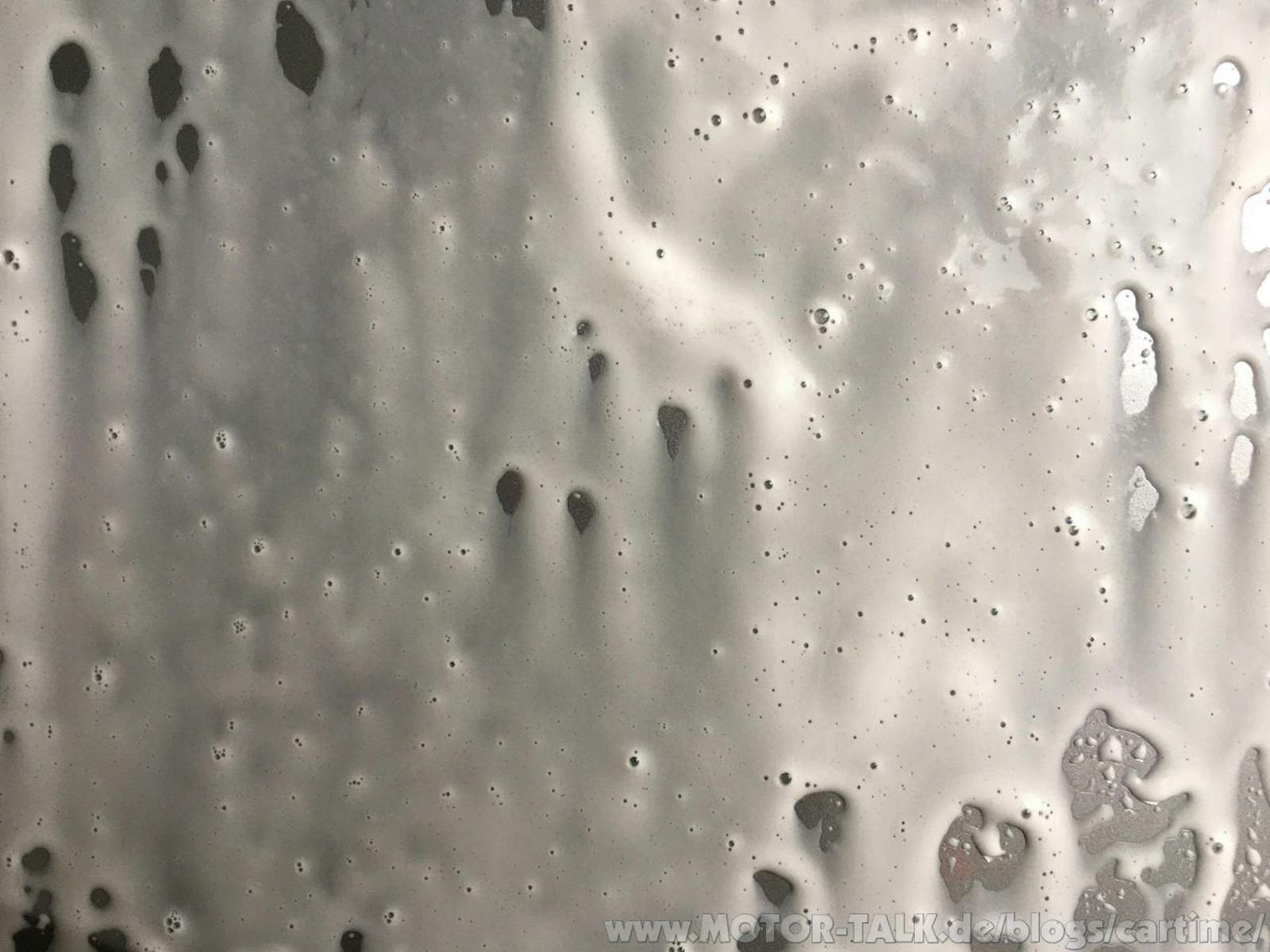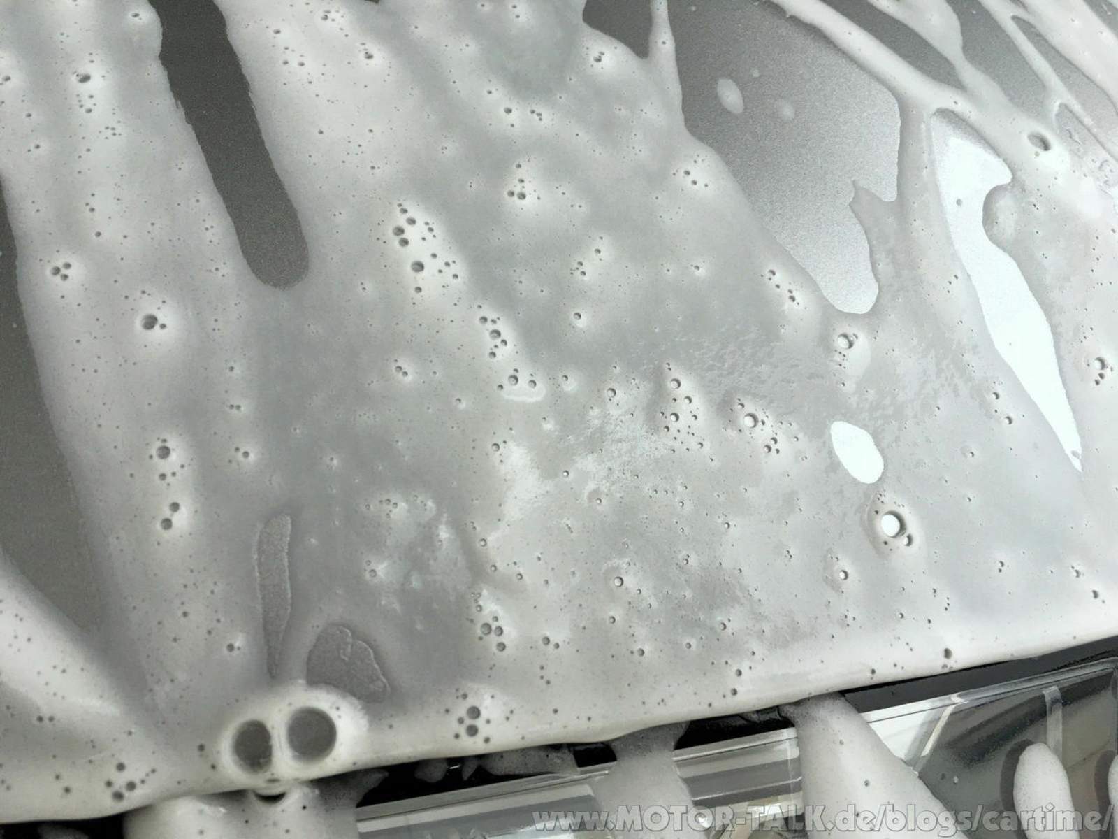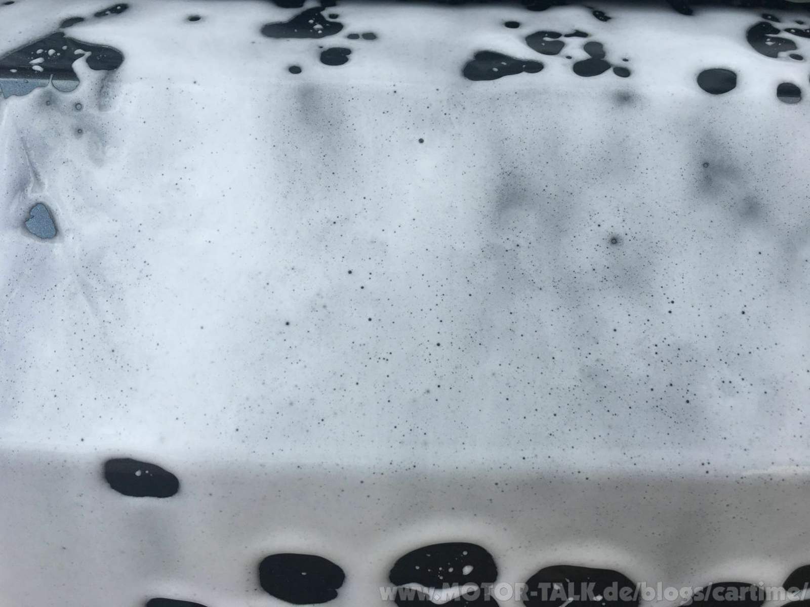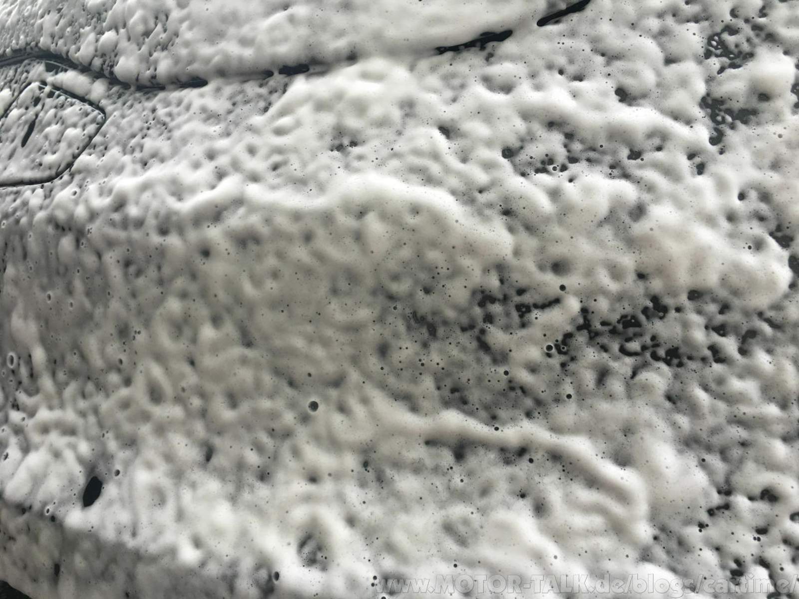 Herrlich beim Waschen ist der Geruch von der Kirsche. Bin das ja durch mein ValetPRO pH-neutral Snow Foam gar nicht gewohnt. Dies ist ja eher zurückhaltend. Um ein möglichst flächendeckendes Schaumbild hinzubekommen kann man die Gloria auch während dem Sprühvorgang etwas schütteln. Sprich während man die Taste drückt die FM 10 etwas hoch und runter bewegen. So zieht sie etwas Luft und sprüht flächendeckender aus. Sieht man wenn sich vermehrt kleine Luftbläschen bilden.