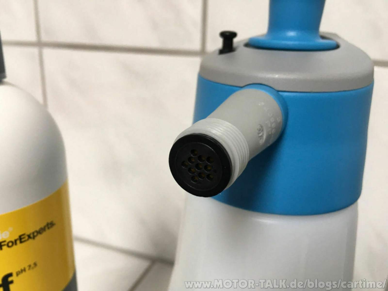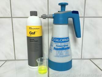 Ich habe es mit 25 ml auf 1 L Wasser in dem Schaumsprüher Gloria FM 10 versucht. Dabei fand ich dieses Mal den roten Containereinsatz am besten. Nochmal kurz zur Info, es gibt 3 Containereinsätze. Blau: dünnes Schaumbild. Rot: Mittleres Schaumbild. Schwarz: dickes Schaumbild. In meinen Tests habe ich herausgefunden, dass das Gsf mit rot zwar dünner ist, dafür aber flächendeckender ist. Das gefiel mir besser als das dicke, manchmal nicht so deckende Schaumbild. Welches dann auch schneller abläuft. Aber am Ende Geschmacksache. Man muss auch bedenken, dass es auch nicht so sein darf das es gar nicht abläuft. Irgendwie muss der Schmutz ja schonend runter. Blau habe ich nicht versucht das würde mir dann ein wirklich zu dünnes und wässriges Schaumbild geben.