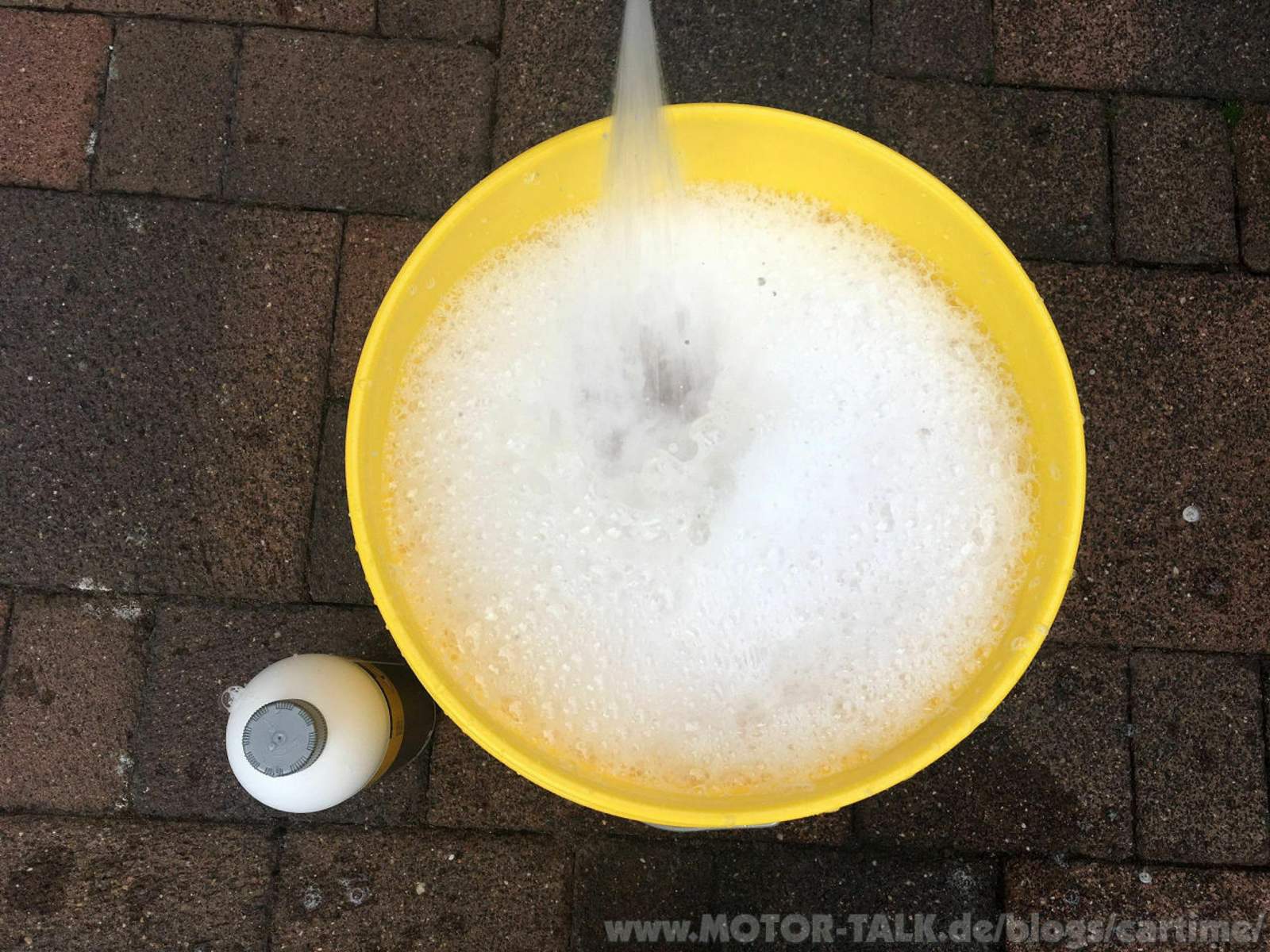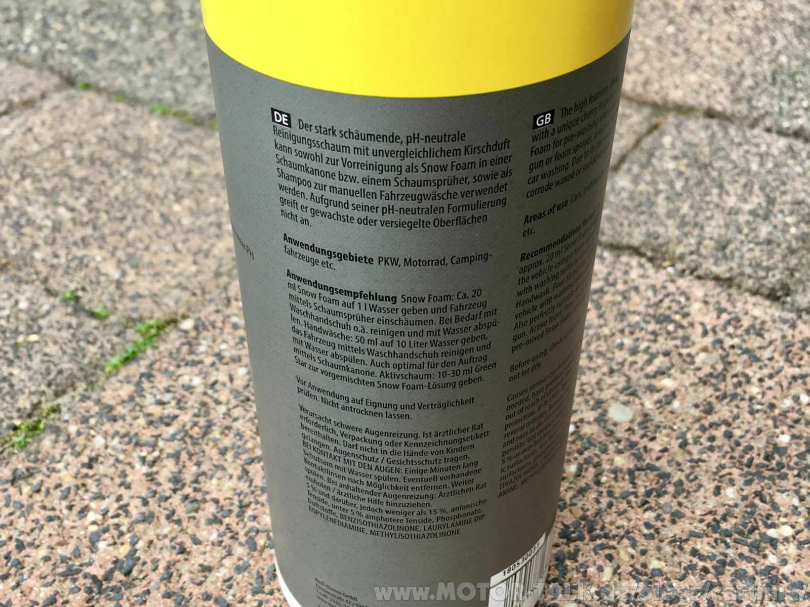 Tipp: Möchte man Insekten oder wirklich starke Verschmutzungen loswerden kann man etwas vom Koch Chemie Green Star mit zu dem Gentle Snow Foam mischen. So um die 10-20 ml sollten da reichen. Das kann logischerweise dazu führen, dass die Wachsschicht angegriffen werden könnte. Kommt natürlich auch auf Faktoren wie die Einwirkzeit an und ob es sich um ein rein natürliches Wachs usw. handelt.