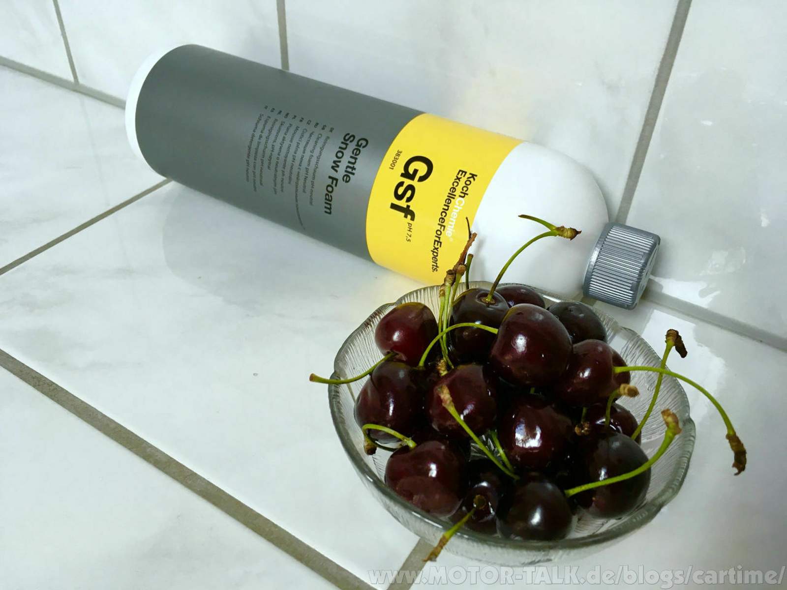 Im dritten und abschließenden KC-Artikel geht es um die Koch Chemie Neuheit Gentle Snow Foam. Ein Snow Foam und Autoshampoo gleichzeitig. Heißt man kann es im Schaumsprüher verwenden, aber auch später in den Wascheimer geben zum Waschen. Die schon etwas dickere Lotion riecht richtig heftig nach Kirsche. Würde ja echt gern mal probieren, aber hmmm... Lieber nicht. Entgegen der Erwartung ist die Farbe der Flüssigkeit gelb. Yellow Cherry, interessant. Auf geht’s zum testen.