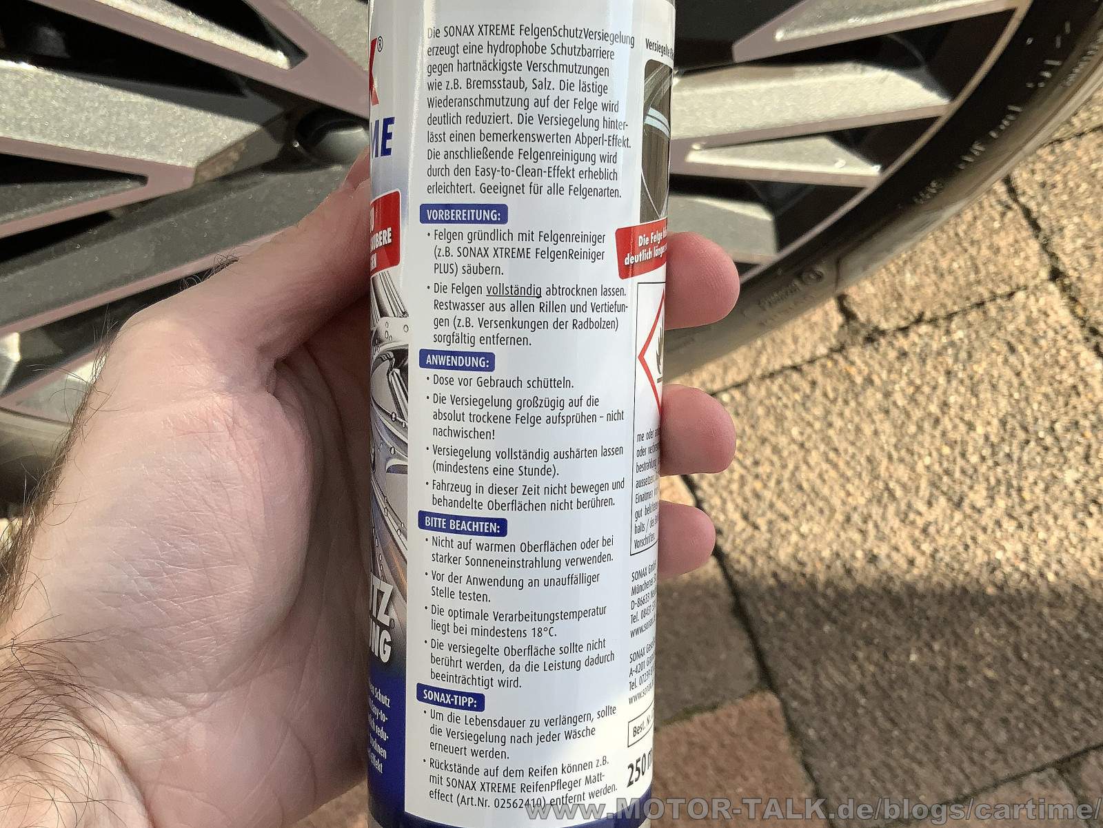 Die Sonax XTREME FelgenSchutzVersiegelung ist ein schnelles Lackschutzprodukt für Felgen. Mit spezieller sogenannter Heat-Resistance-Formel für eine hitzebeständige Schutzschicht auf den Felgen. Vermindert Angriffe durch Bremsstaub, Schmutz und UV-Strahlung. Man muss sie trocken auf die saubere Felge aufsprühen. Also nach der Wäsche, dem abspülen und dann trocknen. Man schützt auf diesem Weg schnell seine Felgen und diese sollen nicht mehr so schnell Bremsstaub ansetzen. Auch braucht es später bei den nächsten Wäschen eigentlich nur noch pH-neutrales Shampoo zum Waschen oder den Hochdruckreinigerstrahl mit Wasser. Anwendbar auf eigentlich allen Felgenarten (siehe Auflistung oben). Nicht nur ein Tipp für Felgen mit vielen Speichen.