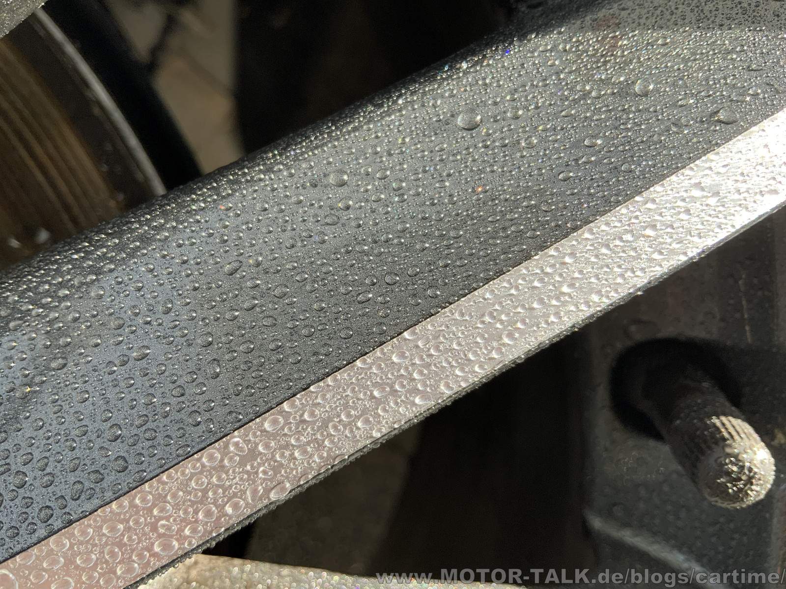 Um das Produkt besser testen zu können, teste ich es nur die Hälfte der Felge. So habe ich später den besseren Vergleich. Habe mir etwas durch die Aerosolflasche,die sehr fein vernebelt, auf die Felge gesprüht. Evtl. die Flasche mal vom Winkel neigen, dass man überall gut hinkommt.. WICHTIG, nicht in praller Sommer Sonne oder auf heißen Felgen anwenden! Es entsteht ein ganz leichter nebliger Film, der aber wieder weggeht.