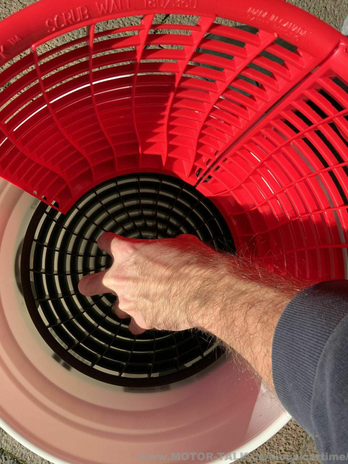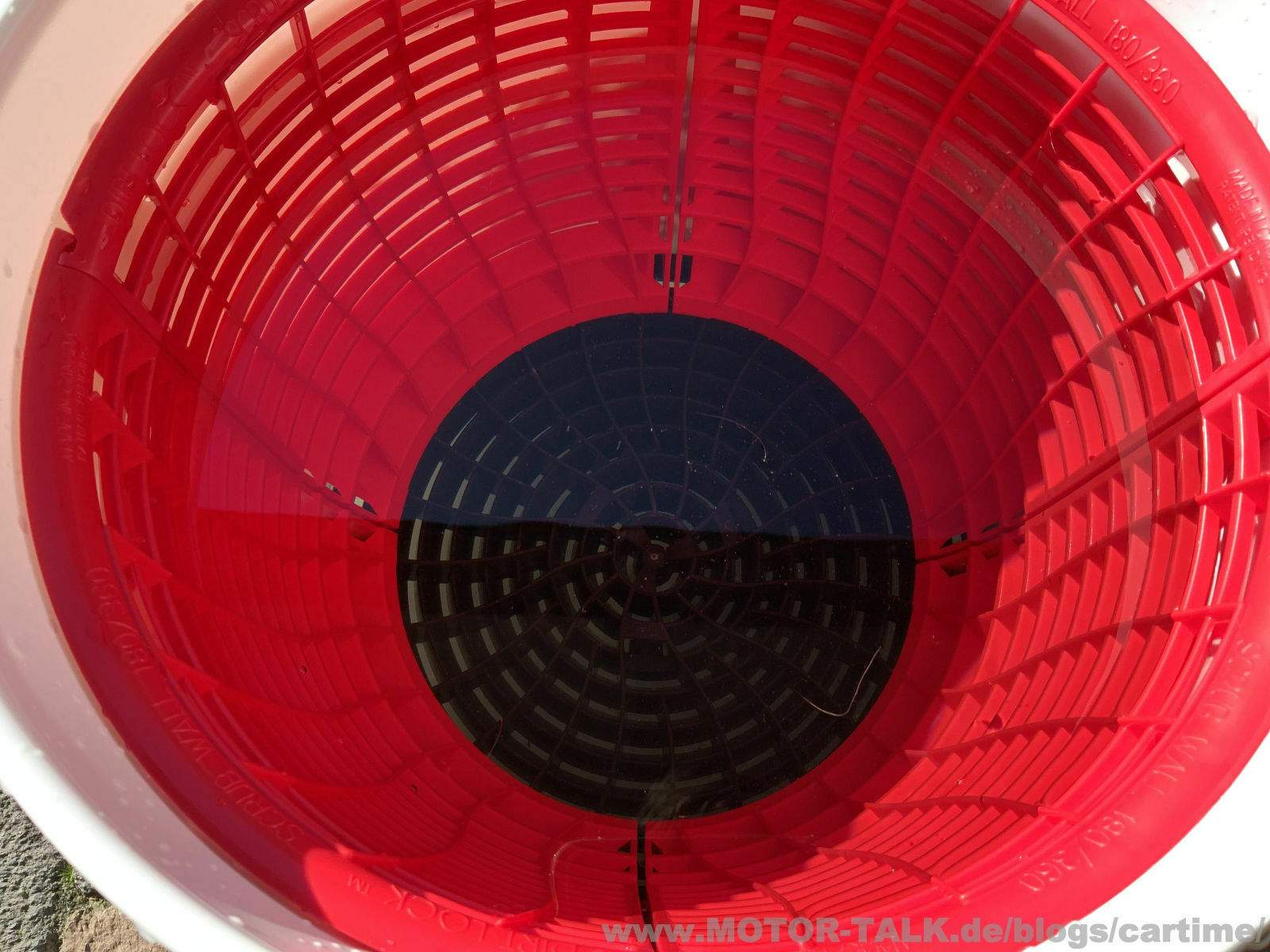 Für alle die neu bei der Handwäsche dabei sind. Bei der Handwäsche wäscht man im Bestfall mit zwei Wascheimern. Das sind sogenannte Gallonen Eimer. In diese passen sogenannte Schmutzsiebe. Sie sorgen dafür, dass jegliche Schmutzpartikel unten im Eimer bleiben und nicht wieder hochgelangen. Denn wenn diese wieder hoch kommen, wie es ohne der Fall wäre, würde man sich mit der Zeit kleine Kratzer (Swirls) in den Lack ziehen. Das ist das, was man auf jedenfall vermeiden möchten. Es gibt also zwei Wascheimer, in einen kommt Shampoowasser zum Waschen. In den anderen Wasser zum Ausspülen des Waschhandschuh‘s oder -Pads. In den Wassereimer legt man also das Sieb. Denn da sammelt sich der Schmutz.