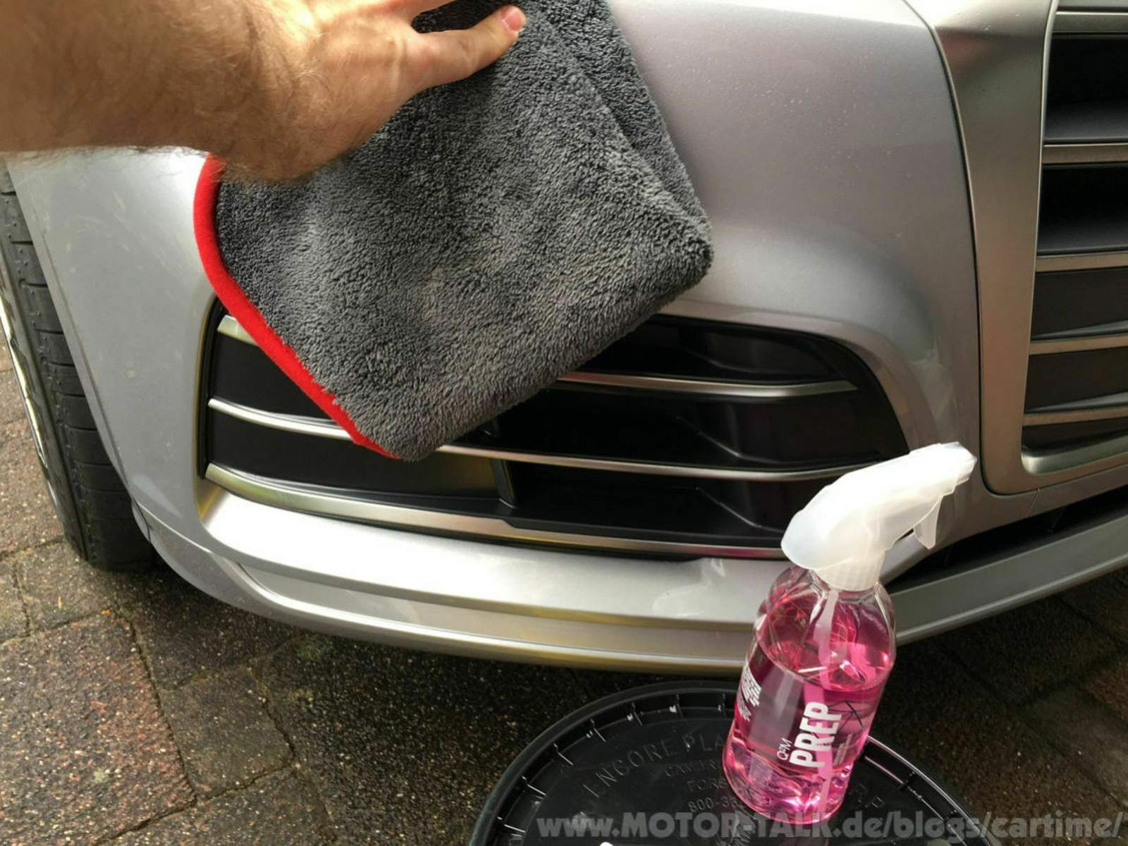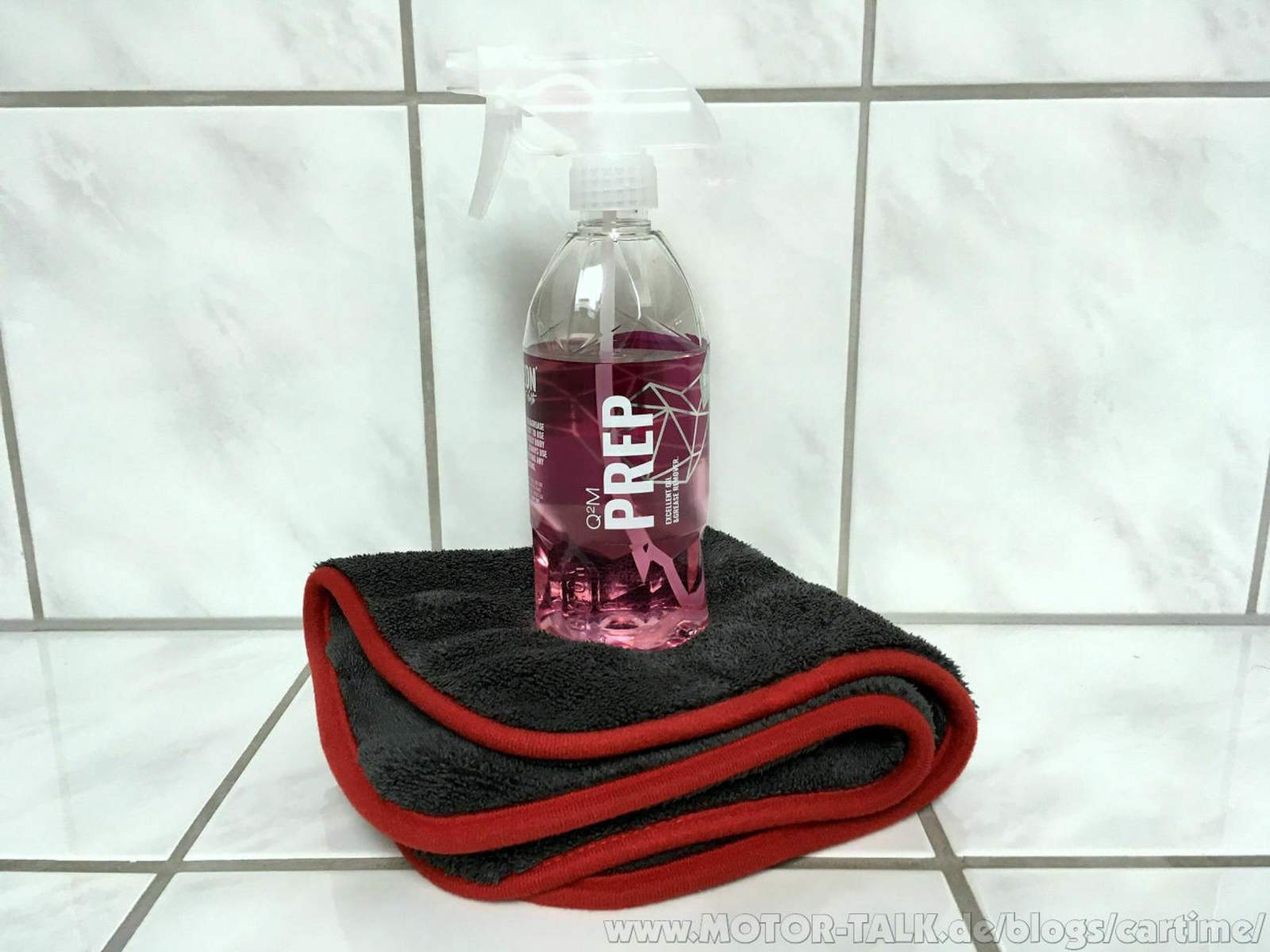 Das Gyeon Q²M Prep ist genau so ein Fertig-Produkt. Riecht sehr fruchtig. Die Flüssigkeit wird aufgesprüht mit einem weichen Mikrofasertuch verteilt und anschließend mit einer trockenen Stelle des Mikrofasertuches abgenommen. Dafür habe ich mir das LE Waxer Allround genommen. Klappt sehr gut. Fertig!
