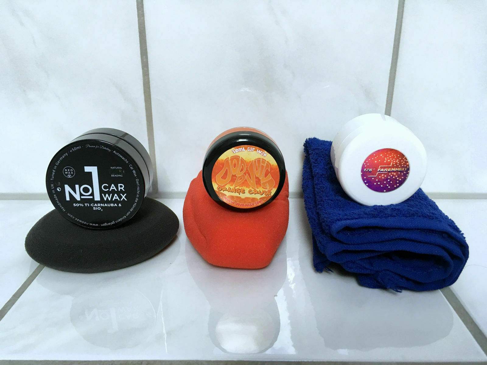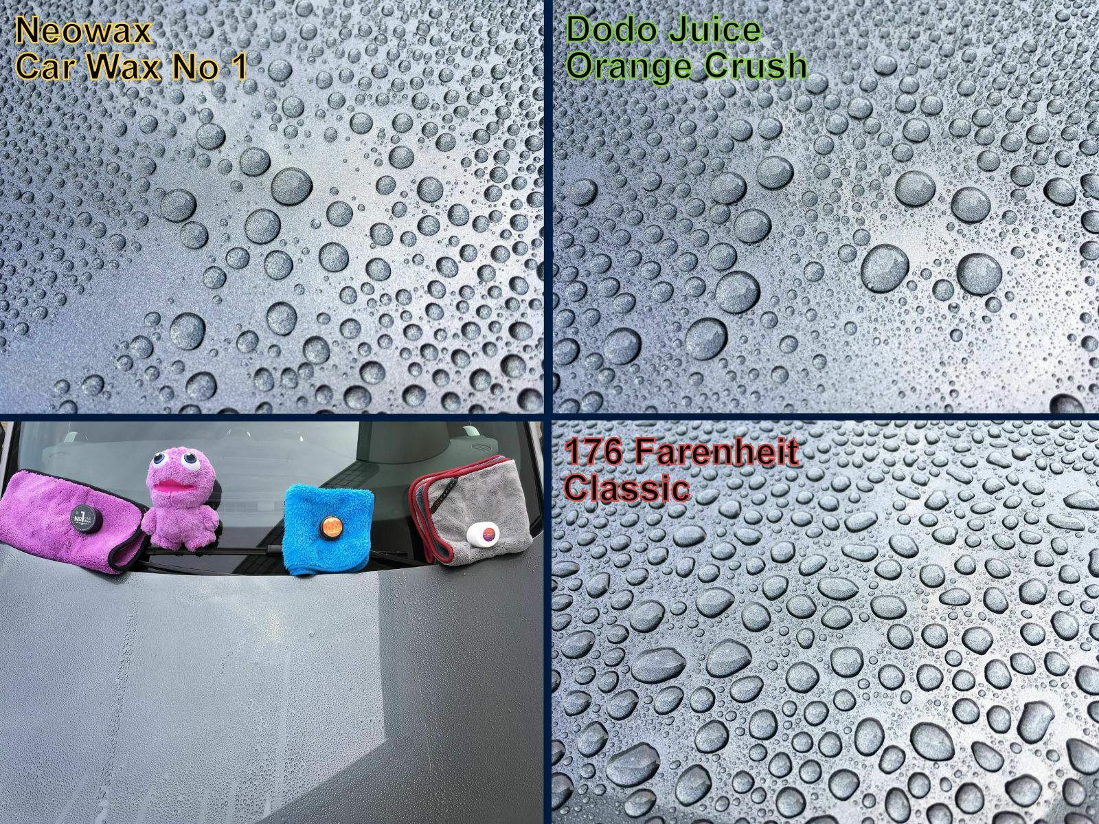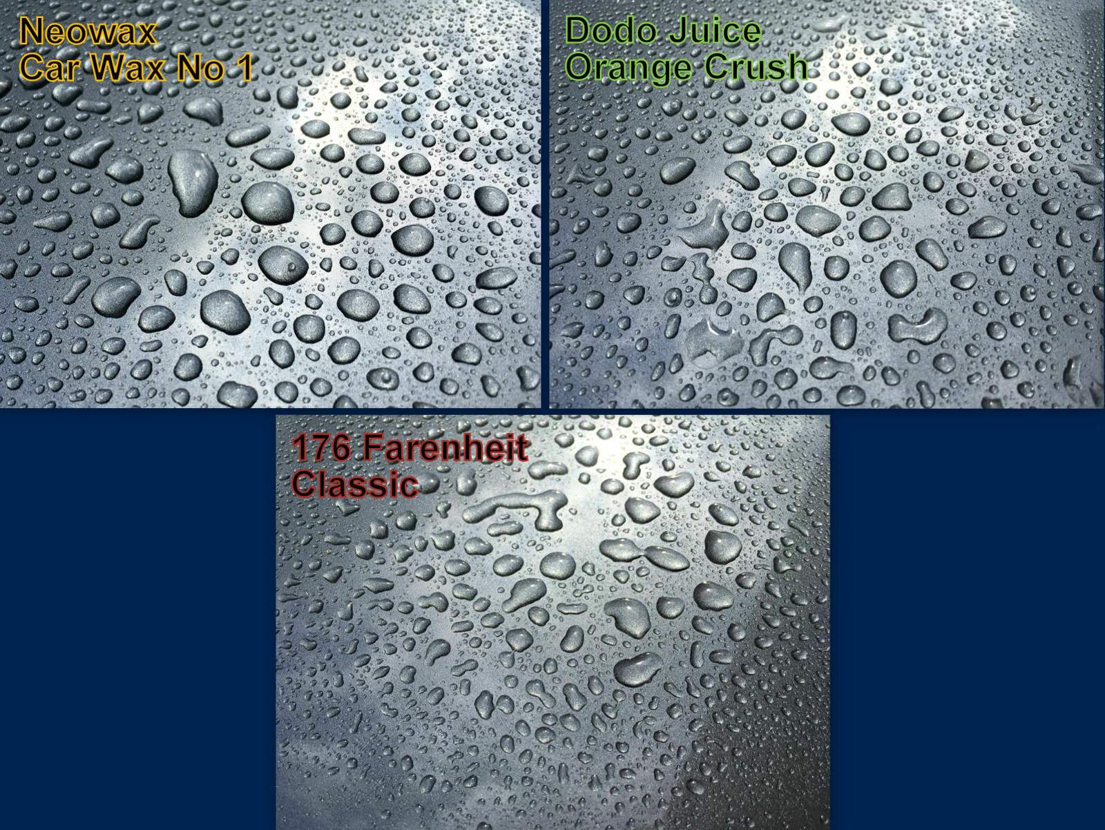 Ein Trio aus drei tollen und vorallem natürlichen Carnauba Wachsen waren zu sehen. Das Neowax Car Wax No 1 und das Dodo Juice Crush Orange Soft Wax lassen sich beide gleichermaßen gut verarbeiten. Der spätere Wachsabtrag ist dann tatsächlich nur noch wie Staub wischen. Funktionierte gut mit den Tüchern von Liquid Elements, Dodo Juice und Rapidi. Im späteren Abperlverhalten sind die Car Wax No 1 und Orange Crush auch nahezu identisch. Sie machen tolle Perlchen. Das Farenheit sticht aus der Menge heraus. Denn das Merkmal ein Wachs stundenlang auf dem Lack zulassen, ohne das etwas antrocknet, das ist schon supi. Der Wachsabtrag mit dem Mikrofasertuch benötigte aber minimal mehr Druck. Das kommt daher, dass das Wachs nie wirklich komplett antrocknete.
