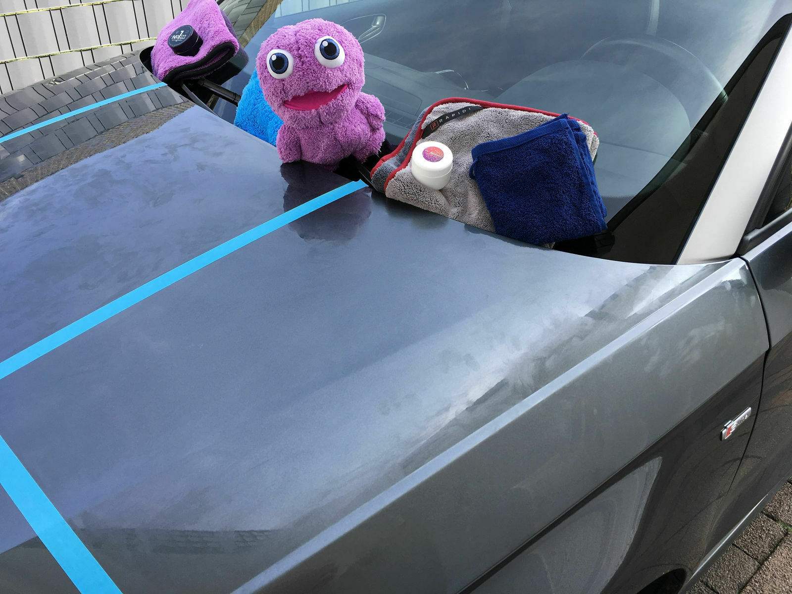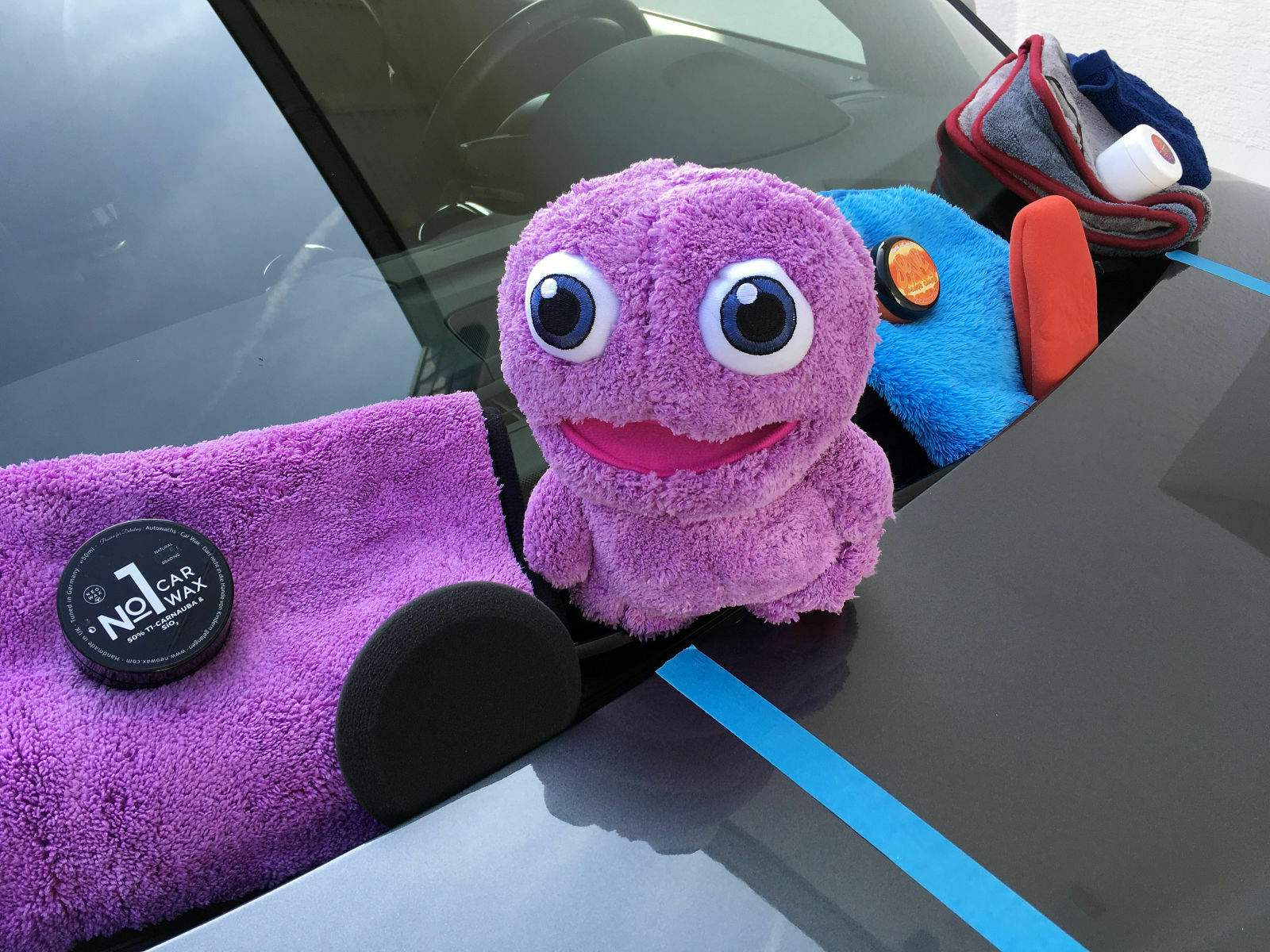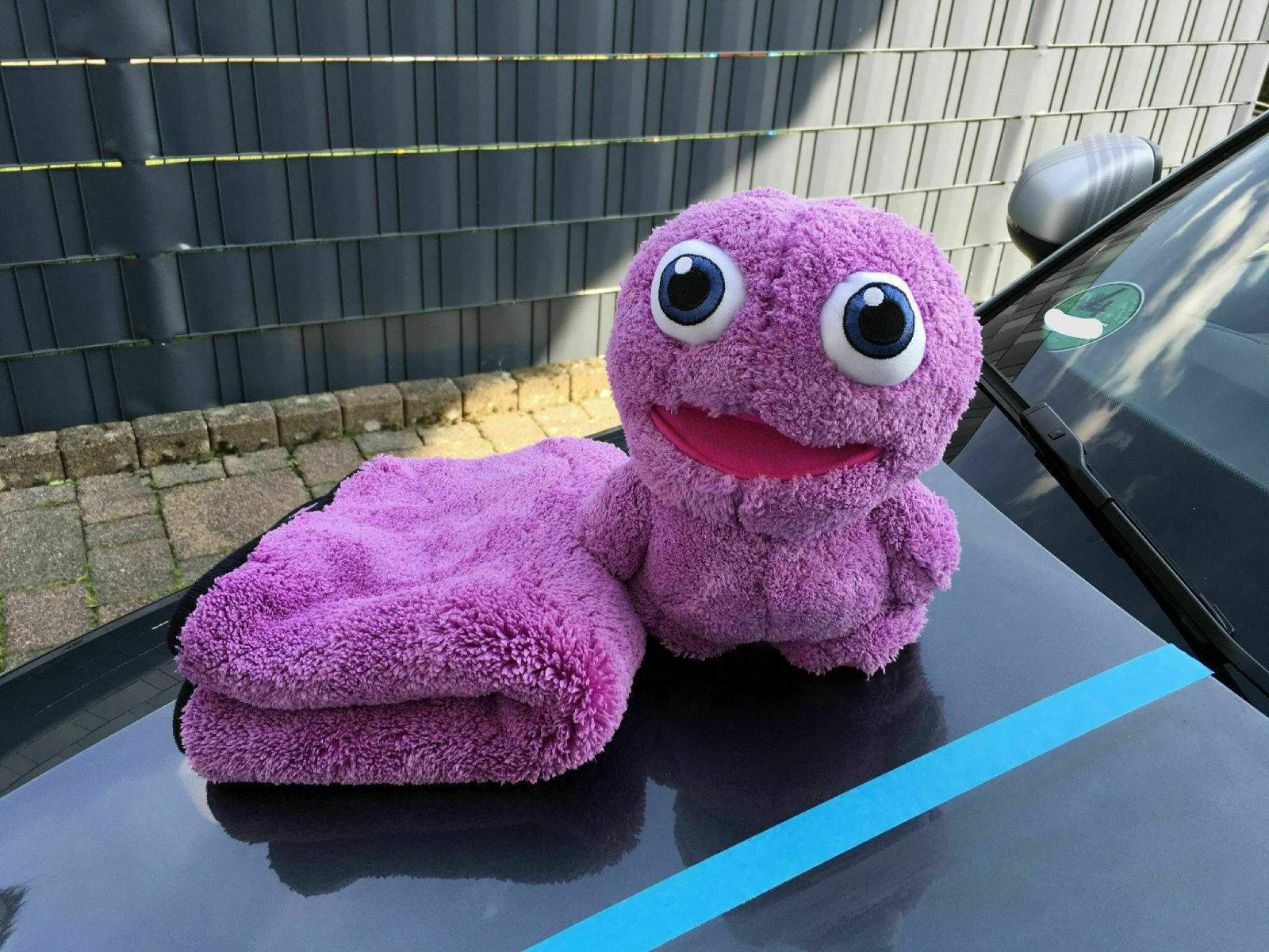 Ein besonderer Gast ist noch mit dabei, er wird aufpassen, dass ich alles richtig mache. Es handelt sich um das Purple Monster. Es ist exakt aus dem selben Mikrofasermaterial wie auch das Mikrofasertuch. Ziemlich witzig... Mr. Skittles, der Dodo Juice „Big Boss“ von Mauritius lässt sich übrigens entschuldigen. Immerhin habe ich ein Tuch aus seinen „Federn“. ^^