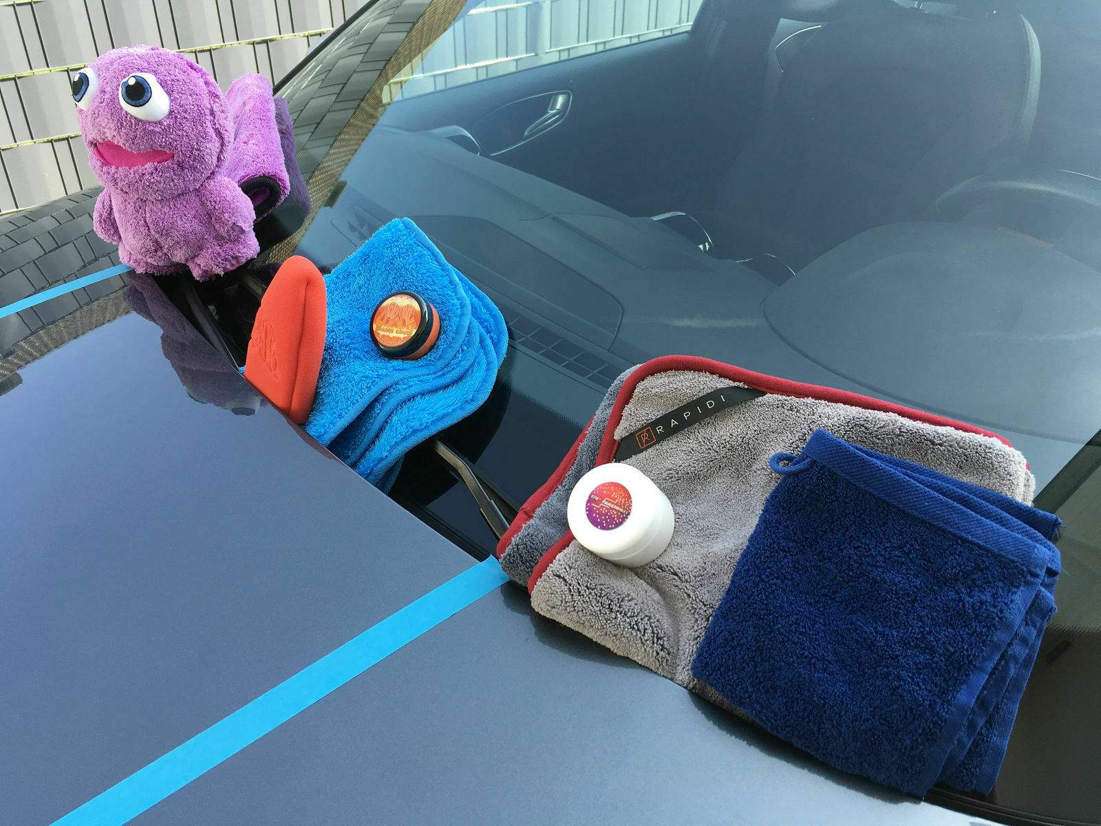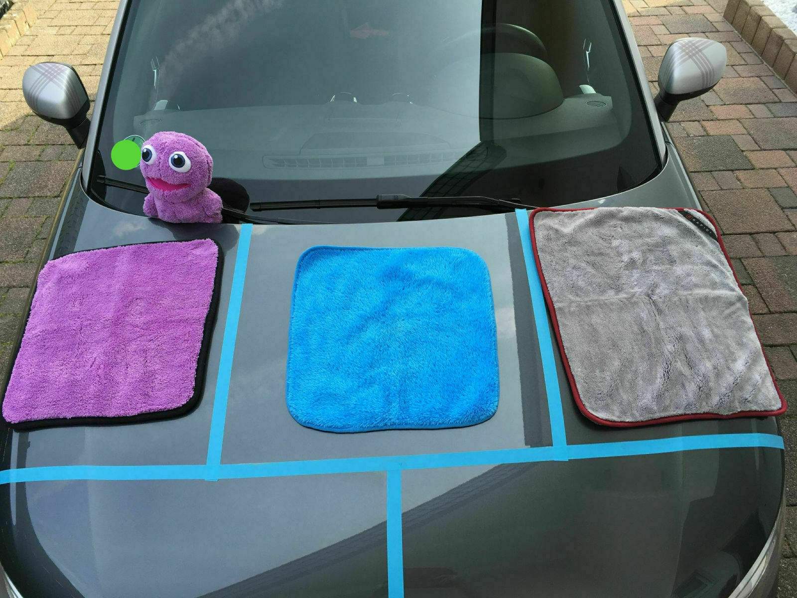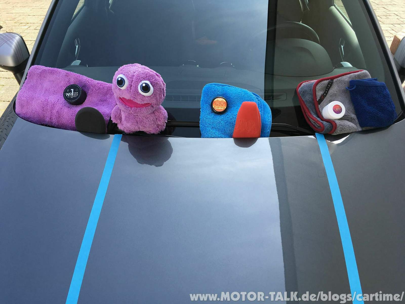 Ein besonderer Gast ist noch mit dabei, er wird aufpassen, dass ich alles richtig mache. Es handelt sich um das Purple Monster. Es ist exakt aus dem selben Mikrofasermaterial wie auch das Mikrofasertuch. Ziemlich witzig... Mr. Skittles, der Dodo Juice „Big Boss“ von Mauritius lässt sich übrigens entschuldigen. Immerhin habe ich ein Tuch aus seinen „Federn“. ^^