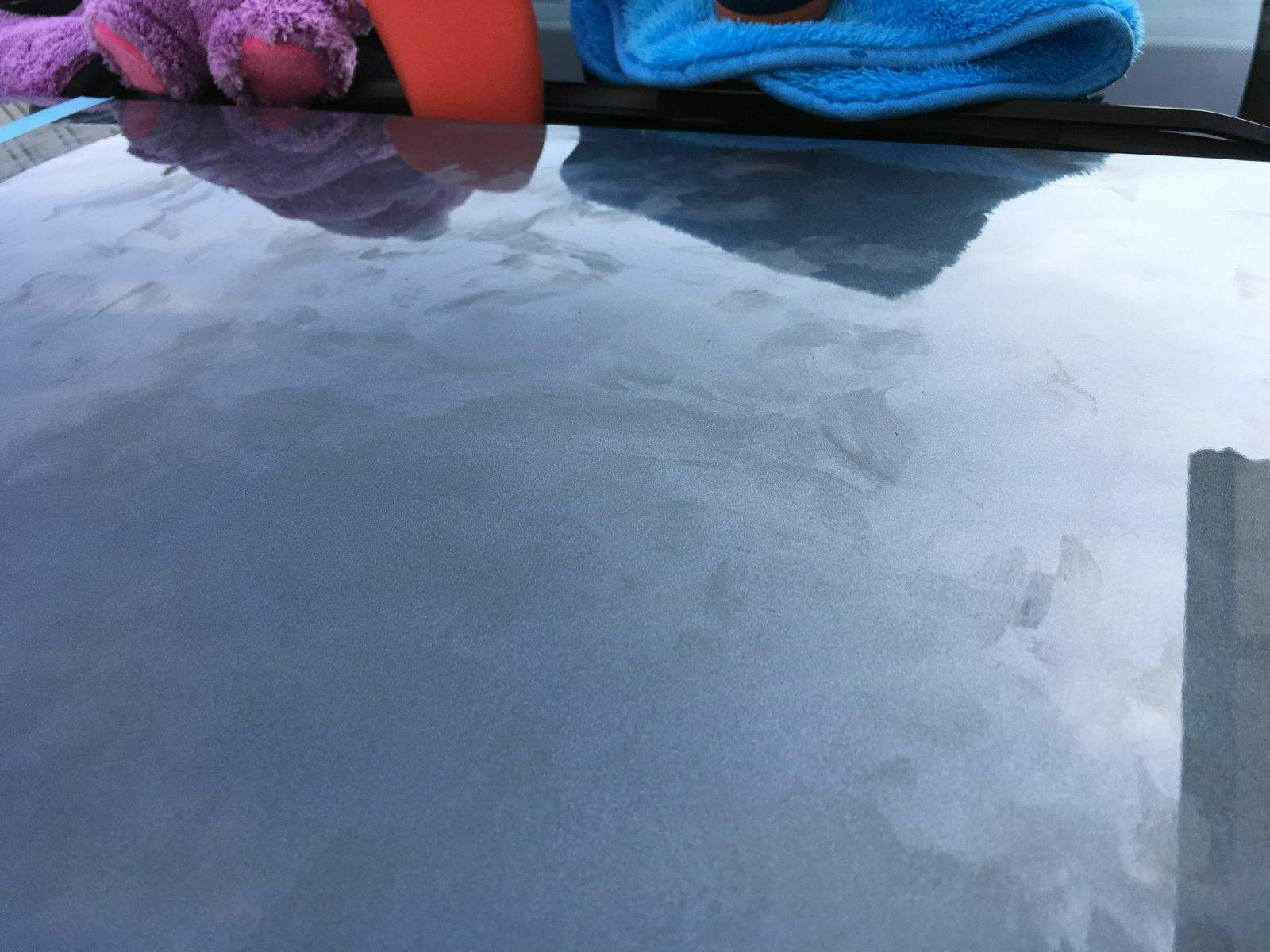 Nach nun ca. 6 Monaten erkennt man keine Grenzen der Testflächen mehr. Diese haben sich verflüchtigt. Etwas perlt es noch, jedoch wäre es nun bald Zeit für Wachs nachlegen. Oder aber zu versuchen mit dem Detailer aufzufrischen. Folgendes Bild ist ein Tag nach dem Waschen enstanden. Dieses Bild ist ein "Natur" Beading von leichtem Nieselregen.