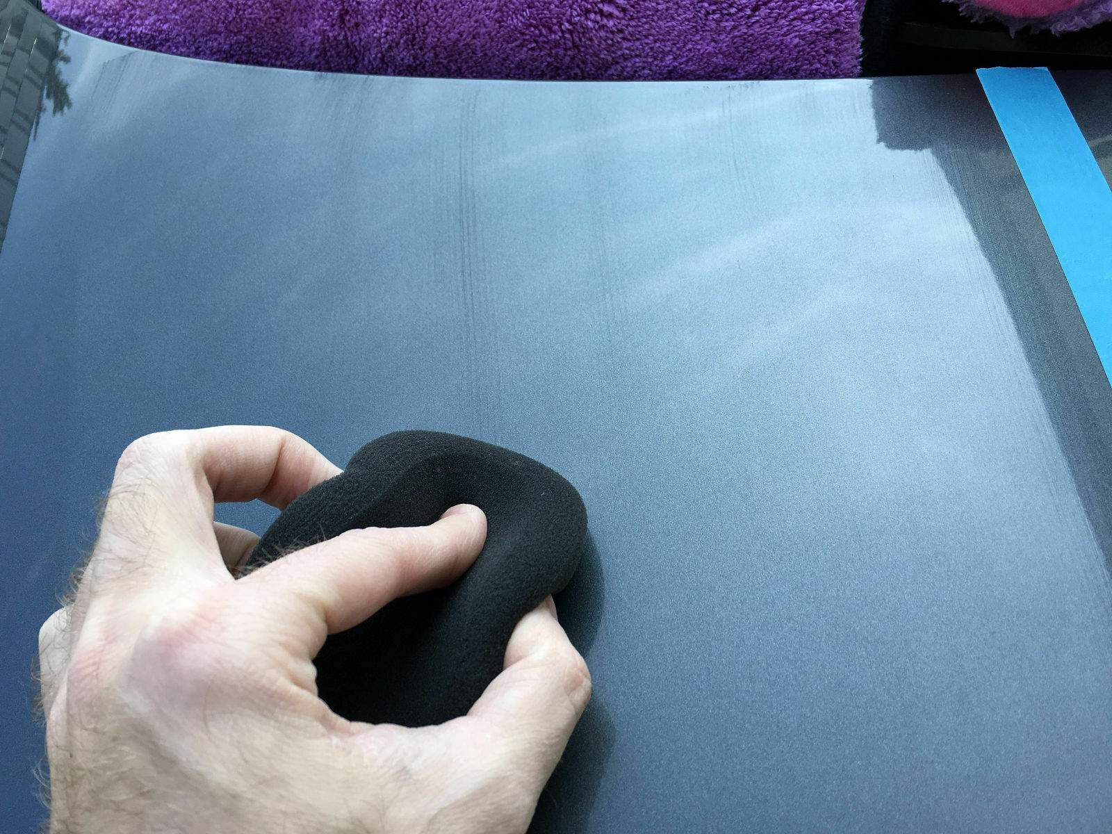 1. Mit einem Applikator Pad, in meinem Fall das hauseigene sehr weiche Neowax Waxpad, gleichmäßig eine dünne Schicht auftragen. Am besten im Kreuzstrich. Also mal längs und dann nochmal seitlich. Handauftrag geht auch, wird aber vom Hersteller nur bedingt empfohlen.