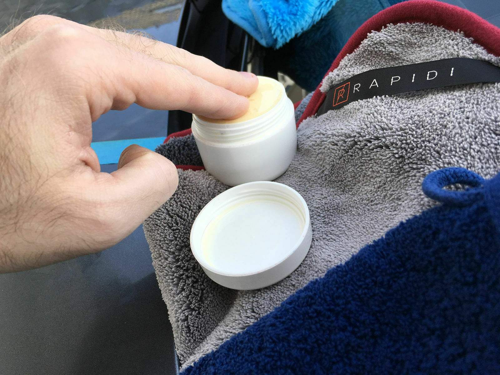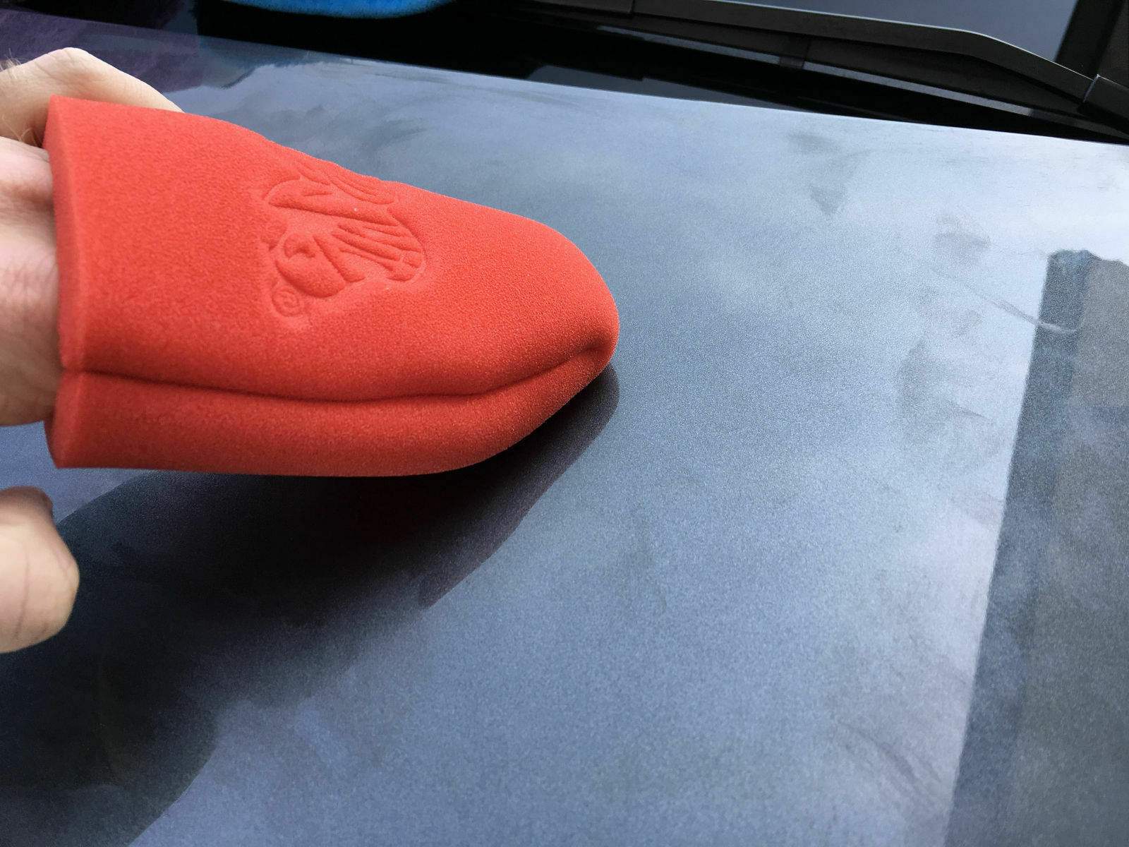 1. Mit einem Applikator Pad, in meinem Fall Dodo Juice Basics of Bling Finger Wax Applicator. Oder mit der bloßen Hand gleichmäßig eine dünne Schicht auftragen. Habe es später mal mit den Fingern versucht. Da ist es bei mir minimal zu dick geraten.