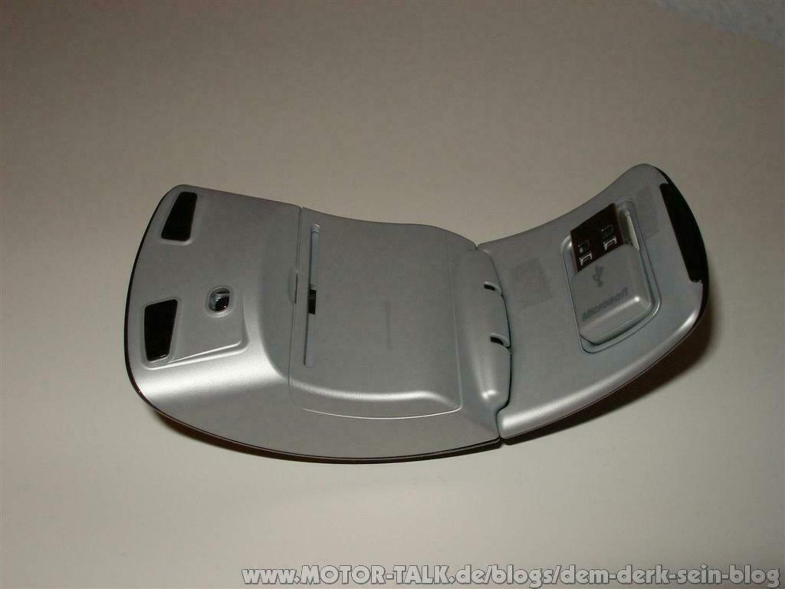 Also - frisch ausgepackt und angeschlossen. Software liegt keine bei, ist aber auch erstmal nicht nötig; Die Maus wird erwartungsgemäß als neues USB-HID erkannt und funktioniert. Wer möchte, kann über die Microsoft-Homepage noch die Intellipoint-Software dazu installieren, welche eine Konfiguration der Daumentaste ermöglicht. Der USB-Dongle wird per Magnet an seinem Platz im umklappbaren "Bürzel" gehalten, und kann durch das Zusammenklappen beim Transport auch nicht herausfallen. Gleichzeitig kann man sich sicher sein, dass die Maus im gefalteten Zustand garantiert ausgeschaltet ist, das sollte sich auf die Batterielebensdauer positiv auswirken - was ich zum jetzigen Zeitpunkt natürlich noch nicht bestätigen kann, seit dem 24.12. brauchte ich zumindest noch keine neuen Batterien