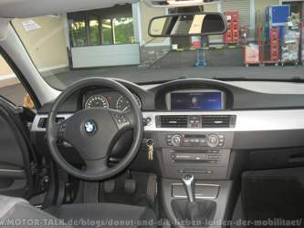 Alle E90 jeden Modelljahres haben dafür eine sehr aufgeräumte, reduzierte Mittelkonsole, was in heutigen Zeiten ja auch eher selten ist. Der Rest der Bordfunktionen ist dafür sehr leicht zu bedienen und in der langen Sonderausstattungsliste gibt es einige nette Extras, die man unbedingt dazubestellen sollte, z.B den recht gut funktionierenden Regensensor, die Sitzheizung, Tempomat oder das meiner Meinung nach sehr empfehlenswerte PDC (Einparkhilfe). Nach hinten ist der Wagen nicht sehr übersichtlich, für Heavy-Parker gerade in Verbindung mit dem Navigationssystem ein nettes Feature, da man zentimetergenau an Hindernisse ranfahren kann (Grafik mit Abstandsanzeige im Display). Das Heck des Wagens ist leider nicht besonders gut abschätzbar, da man im Innenspiegel leider nicht die Oberkante des Kofferraumdeckels sieht - ich möchte es nicht missen, da ich täglich in meist recht enge Parklücken am Bahnhof muss.