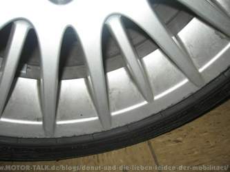 Hier sieht man die "Radialspeiche 160", die derzeit in meiner Garage liegt. An sich in Ordnung, als hässlich würde ich sie nicht bezeichnen, aber ich muss jederzeit an das Coupè eines Altherrenfahrers denken, wenn ich den Wagen ansehe.
