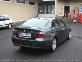 Ein Anruf beim Verkäufer ergab nur, dass er davon natürlich nichts wisse und er mir den Wagen im Glauben übergeben habe, er wäre in einem einwandfreien Zustand. Dass die geschenkten Alufelgen relativ zerkratzt waren und die Reifen vorne relativ abgefahren, war mir da noch eher egal - aber der Parkschaden ärgerte mich dann schon. Der Verkäufer versprach, Rücksprache zu halten und mir in 1-2 Tagen eine Lösung anbieten zu wollen - am liebsten wäre mir natürlich gewesen, einen Teil des Kaufpreises zurückzuerhalten, um das beim lokalen BMW-Händler beheben zu lassen - natürlich konnte er mir nur anbieten, den Schaden in Salzburg beheben zu lassen... 2 x 350 km sind ziemlich genau eine Tankfüllung mit dem Wagen - hmm