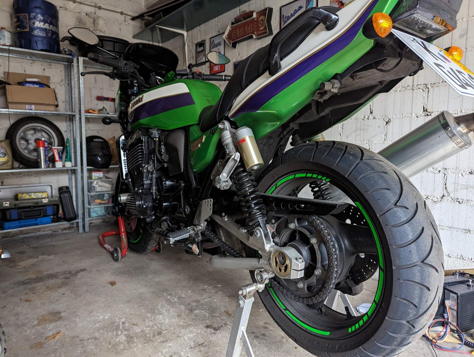 Also im Moment ist es die Grüne, was aber auch daran liegt das die ZZR noch beim Kumpel in der Halle steht und noch ein bisschen Liebe von mir bekommt bevor ich damit ernsthaft in die Saison starte. Auf dem Zettel stehen ja noch so Dinge wie Ölwechsel und neue Reifen. Zeug liegt alles schon hier, Kerzen habe ich schon getauscht, die angekatschte Verkleidung auch.