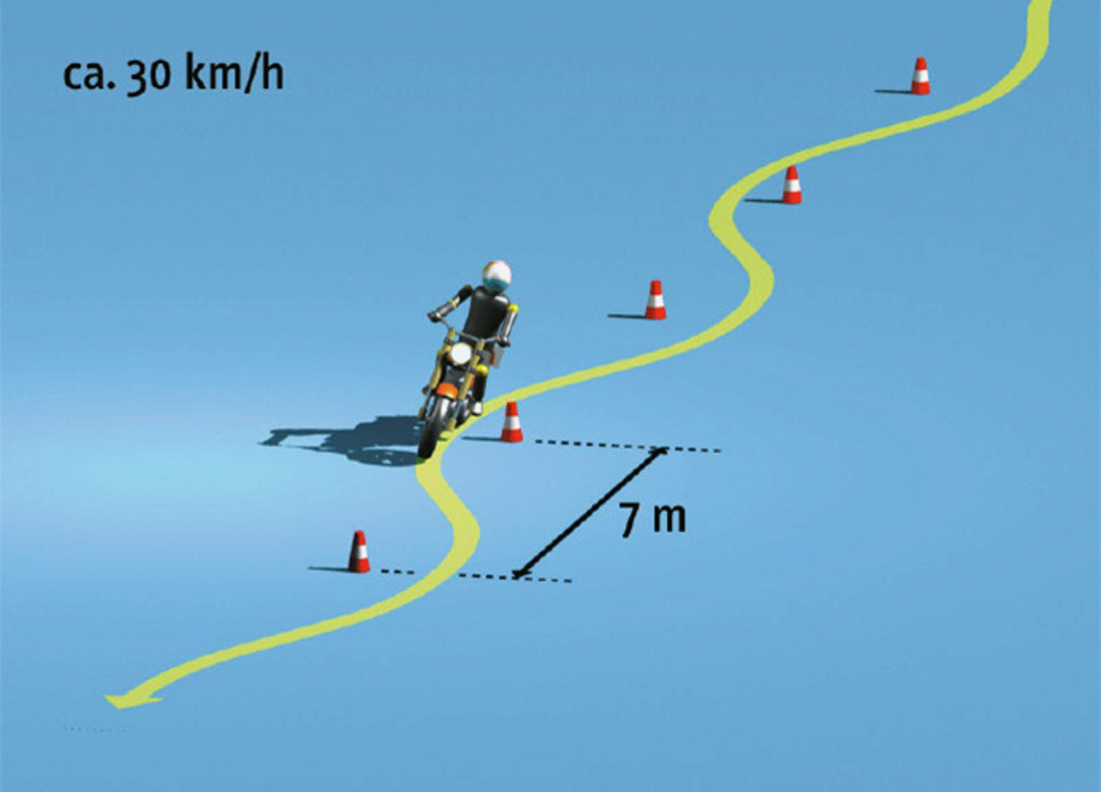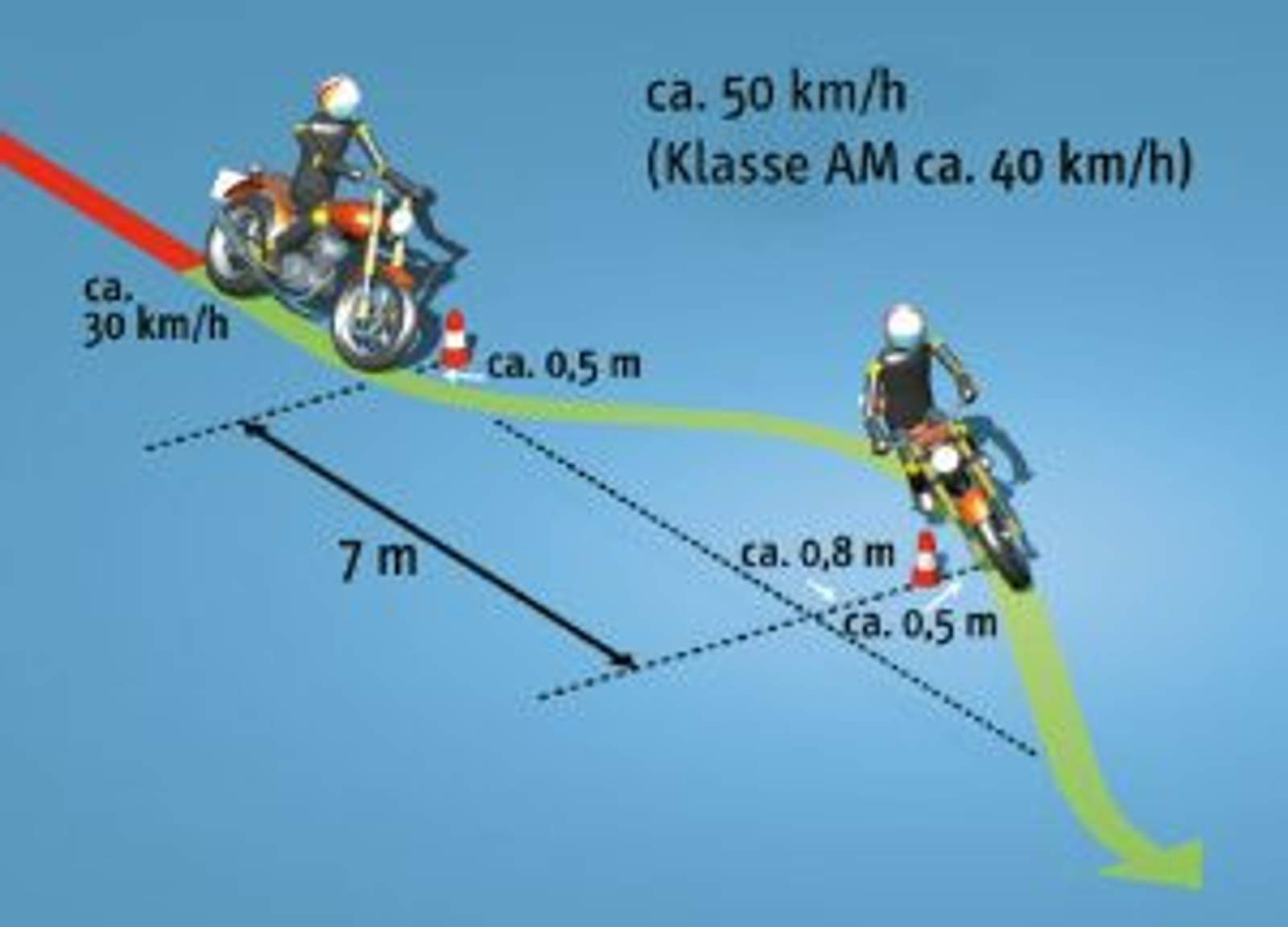 Ich bin damals durchgefallen, weil ich genau diese Übung "perfekt" machen wollte, die Abstände für 50 aber zu eng gesetzt waren (alles Augenmaß) und ich dann hinten überbremst und in Folge gestürzt bin.