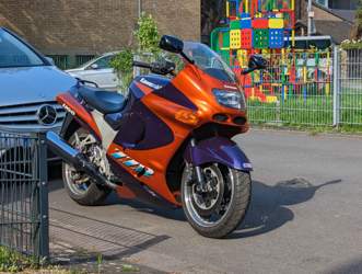 Marke: Kawasaki Modell: ZZR-1100 Modelljahr: 1993 Motor: Reihenvierzylinder 16V Hubraum: 1052 cm³ Leistung: 152 PS@ 10.000 u/min (offen); 98 PS @ 9000 u/min (gedrosselt) Drehmoment: 123 NM @ 8000 u/min (offen); 100 NM @ 6000 u/min (gedrosselt) Farbe: Royal Purple Metallic/Sungod Orange Candy Besonderheiten: Niedrige Laufleistung, Superbikelenker