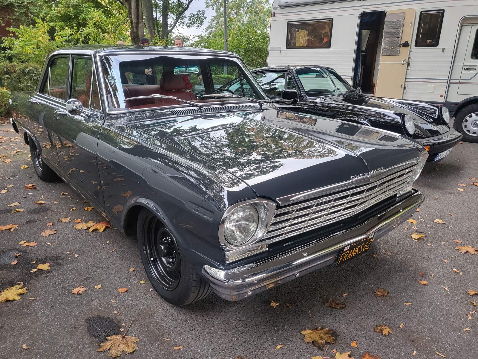 Dort angekommen, war auch schon gut was los. Wir haben gerade noch so einen Stellplatz bekommen! Wie es der Zufall so will, trafen wir sogar einen Bekannten wieder den wir ein Jahr vorher auf einem anderen Treffen mit gesehen hatten. Er hatte seinen Impala wegen Problemen an der Bremse dort abgegeben. So kamen wir ein wenig ins quatschen und schauten uns mal in der Werkstatt um. Dort standen einige Restaurationsprojekte in verschiedenen Stadien herum. Eine C2 ohne Hinterachse erregte meine Aufmerksamkeit. Man konnte so wunderbar mal den Rahmen und das Fahrwerk begutachten. Besonders die Querblattfeder war gut sichtbar