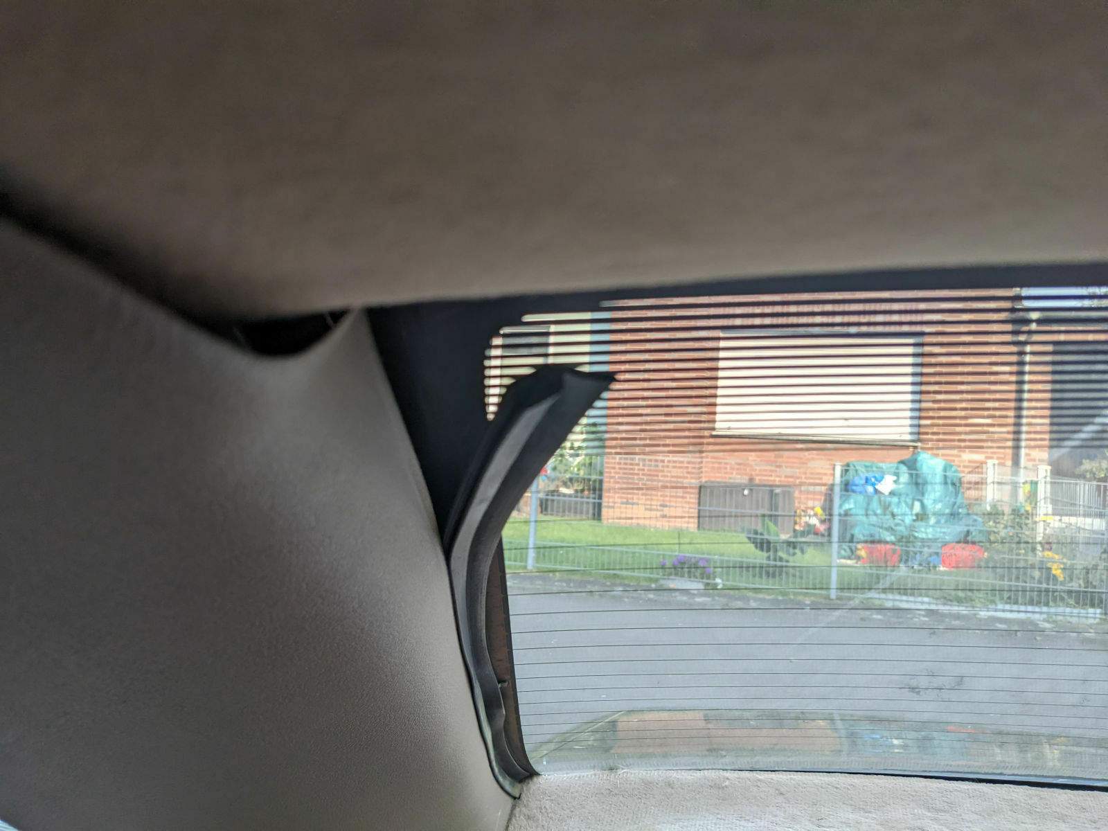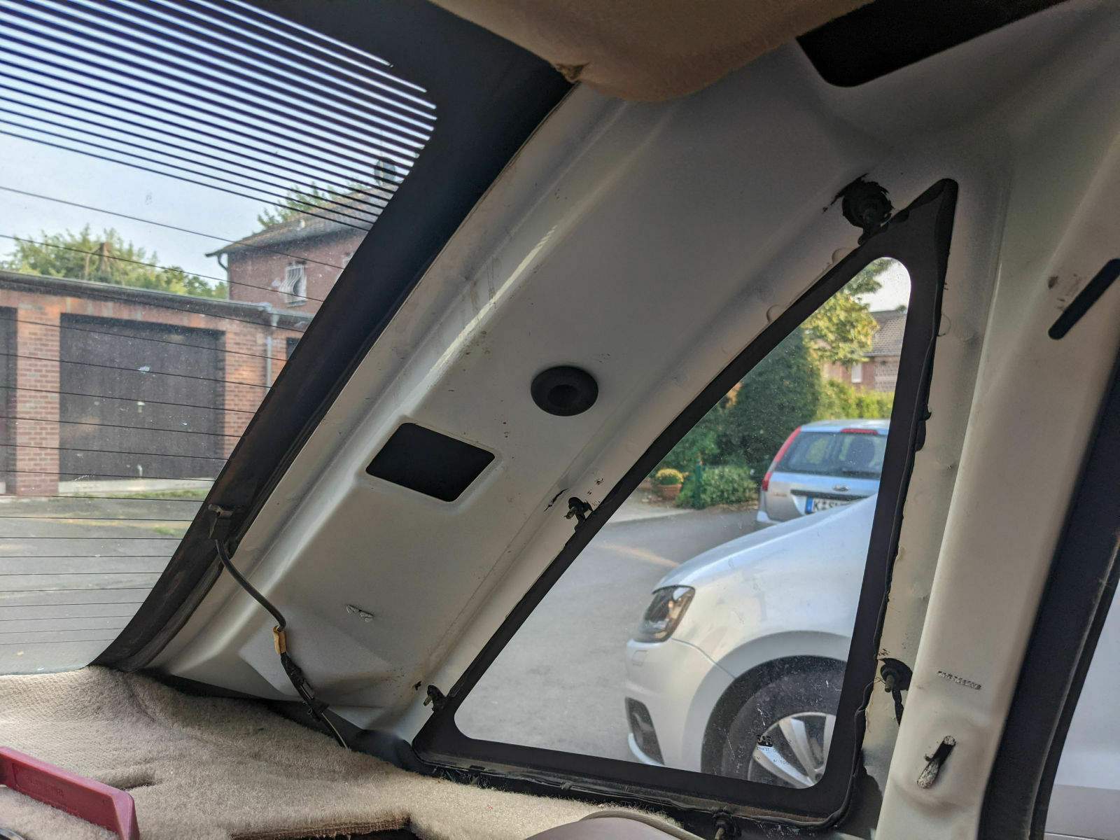 Jetzt geht es ans Eingemachte, denn jetzt geht es an die Verkleidungen! Erstmal muss die Verkleidung der hinteren Dreieckfenster weg. Dazu muss zuerst die Lautsprecherabdeckung runter. Diese sind lediglich 4x geclipst und lassen sich mit der richtigen Mischung aus Fingerspitzengefühl und Gewalt gut lösen. Auch hier hilft ein Hebelwerkzeug wieder enorm! Danach geht es schon an das Plastikteil. Dieses wird von drei Klammern gehalten. Zwei davon befinden sich jeweils oben und unten an der C-Säule, die dritte oben an der D-Säule. Diese einmal ausklinken und das daran befindliche Zierteil abziehen. Es kann gut sein das die Metallhalter in der Karosserie stecken bleiben. Diese sind ab Werk lediglich auf so eine Art Plastikschiene aufgeschoben und dann wird das Plastik von oben so verschmolzen das die Klammer sich nicht mehr aus der Schiene bewegen kann, so zumindest die graue Theorie. Funktioniert natürlich nicht bzw. nach 30 Jahren wo gefühlt schon 15 mal an den Verkleidungen herumgewurstelt wurde nicht mehr. Ich beschloss das Ganze bei Gelegenheit zusätzlich irgendwie mit Kleber zu sichern damit es nicht mehr so leicht aus der Halterung springen kann. Damit hat man den Teil schon einmal demontiert.