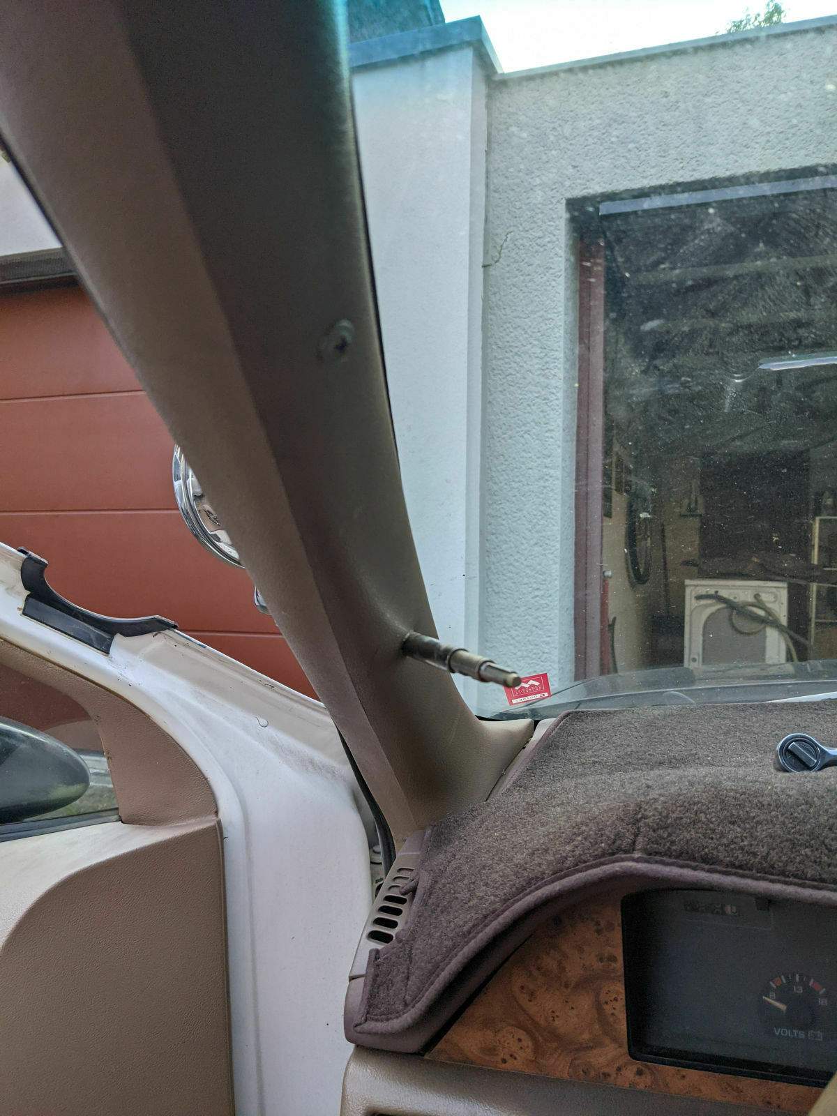Hier wird es spannend! Da unser Auto Spotlights hat müssen diese demontiert werden. Dazu entfernt man einmal die große Schraube in der Seite welche den Griff selbst festhält. Das Ganze ist mit einer Art Gewindehülse versehen, die ein Innengewinde hat und die sich durch den Druck der Schraube in den Griff reinzieht und den Griff so an Ort und Stelle hält. Als Trick schraubt man die Schraube raus, schraubt sie auf der gegenüberliegenden Seite wieder rein und hebelt dann die Hülse incl. Schraube aus dem Griff. Et voila, schon hat man den Griff an einem Stück in der Hand. Danach zieht man das Gummistück, den dazugehörigen Haltering und den Klemmring der das Kabel hält einfach von der Stange ab. Danach muss man von außen die dicke Torxschraube anlösen welche die Stange gegen verrutschen sichert. So kann man dann die Stange so weit nach draußen ziehen, dass man an die Verkleidung kommt. Danach geht es an die A-Säulenverkleidung. Diese werden von zwei Klammern gehalten. Im Falle des Sheriffs muss auf der Fahrerseite noch eine Spaxschraube gelöst werden, welche das Department liebevoll in die A-Säule gespaxt hat. Mit etwas liebevollem ziehen und einem Hebelwerkzeug geht das Ganze schon ganz gut ab. Dabei immer schön mit den Halteklammern aufpassen