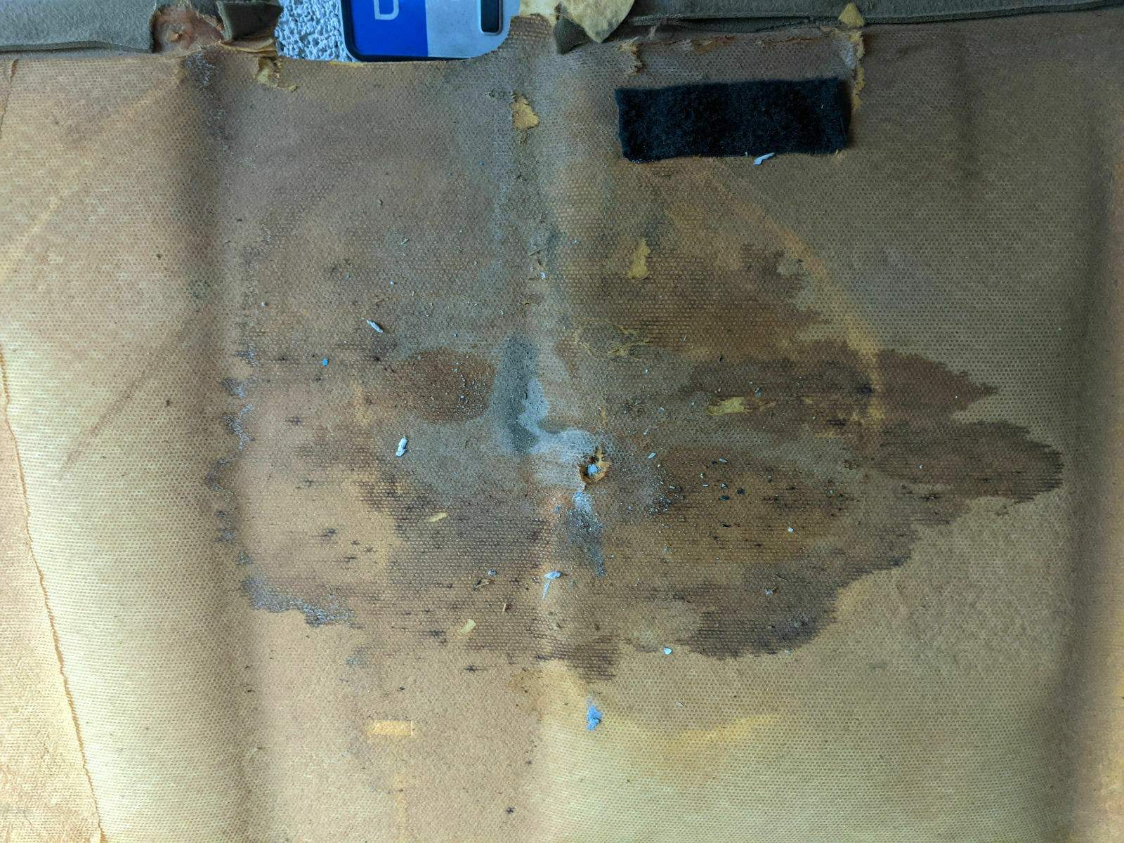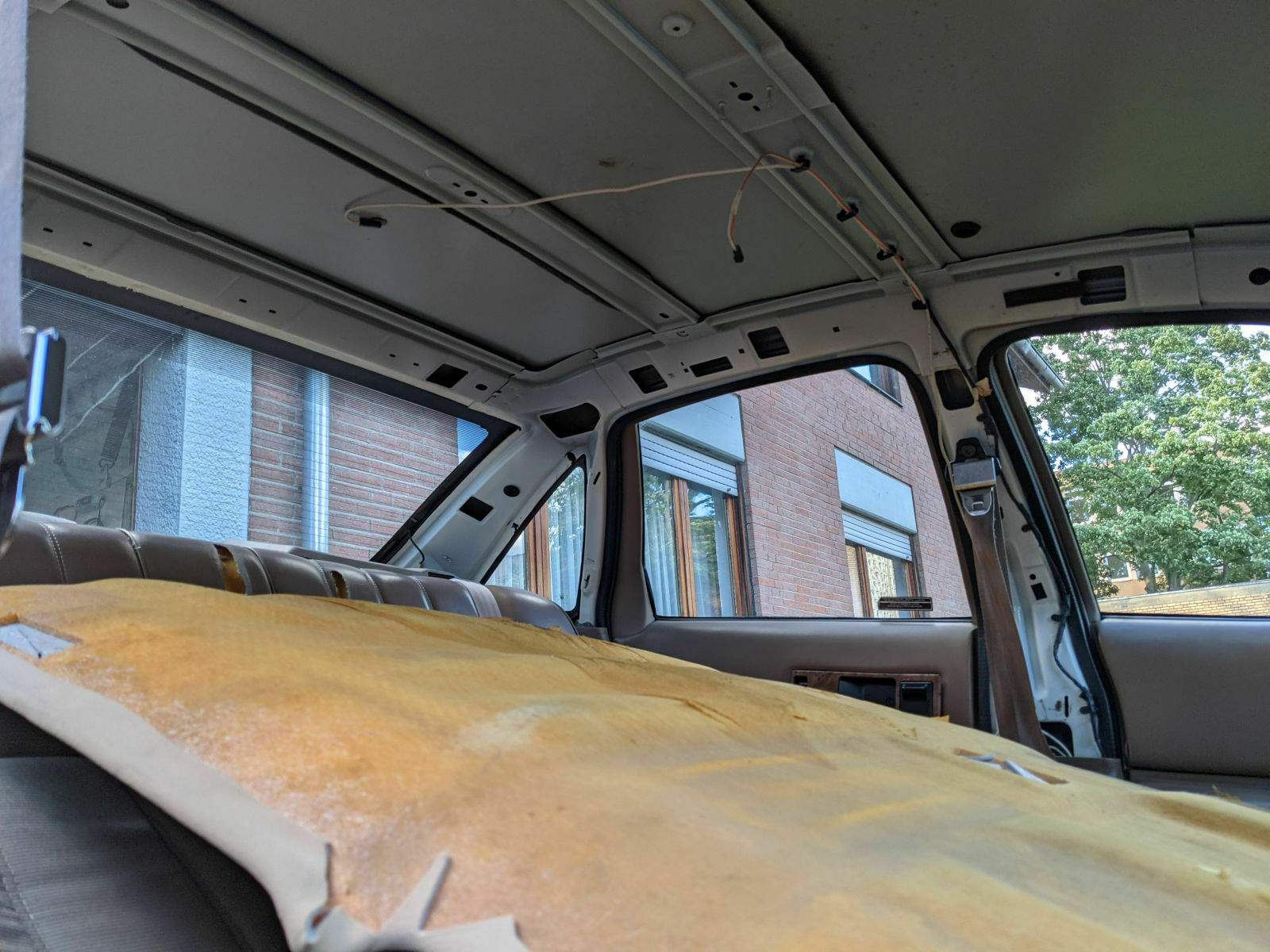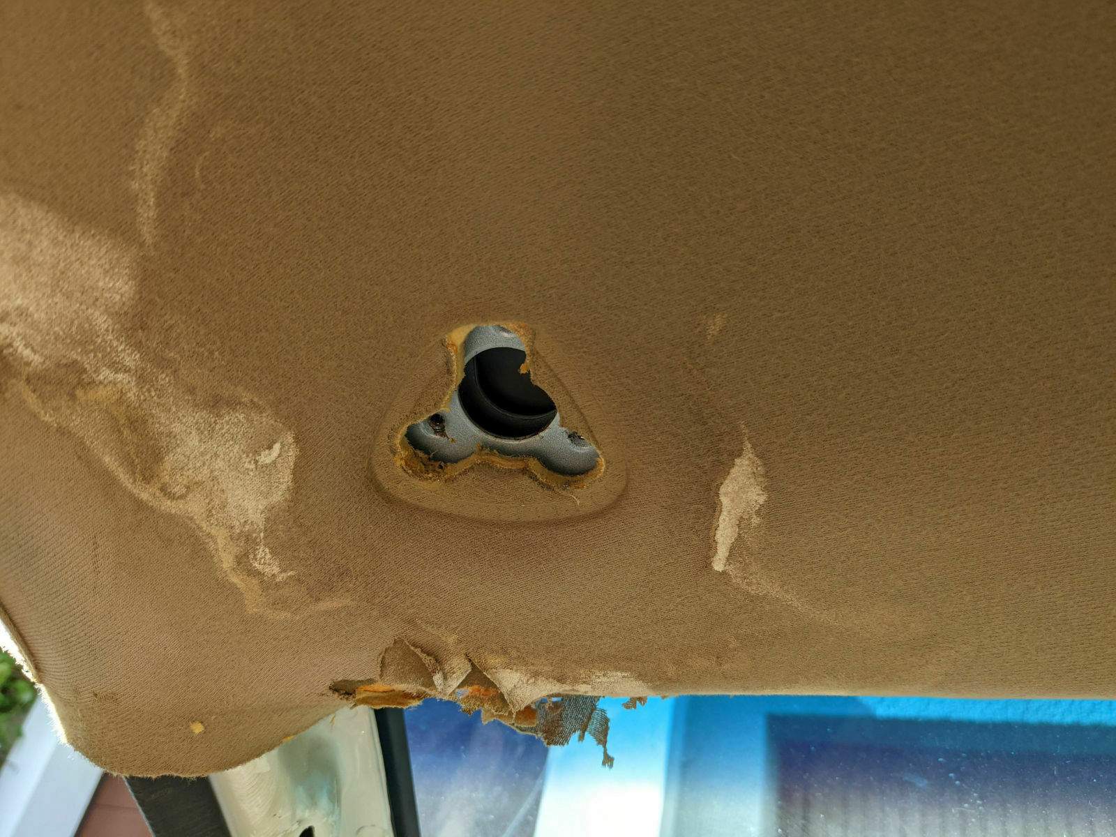 Damit ist der Himmel dann draußen. Man sieht, der Himmel hat etwas Liebe dringend nötig. Dafür ist das Blech am Dach quasi im Neuzustand. Durch das Loch der Lichtbalkenverkabelung ist wohl mal Wasser eingedrungen, was die Wasserflecken an den Rändern und die Flecken und den leichten Schimmelbefall an der Innenseite des Himmels an genau der Stelle erklärt. Muss wohl noch in den USA passiert sein, da die Flecken schon sehr alt sind und der Wagen bei uns immer trocken war, auch bei Starkregen! Bei der Gelegenheit fiel mir dann auf das dieses kleine weiße Kabel in der B-Säule gar nicht vom Lichtbalken, sondern von der Funkantenne stammte. Das Kabel läuft vom Antennenfuß direkt unter dem Dachhimmel bis hin zur B-Säule durch. Bei dem Auto lernt man nie aus!