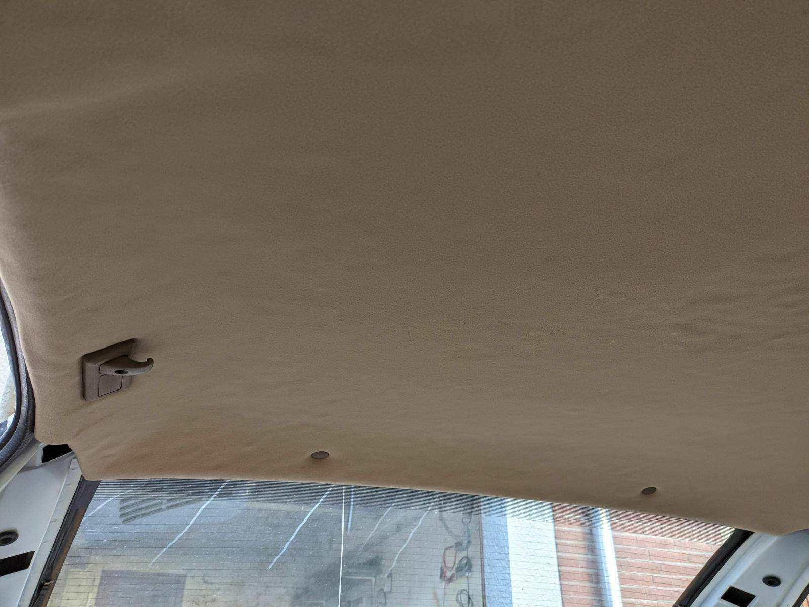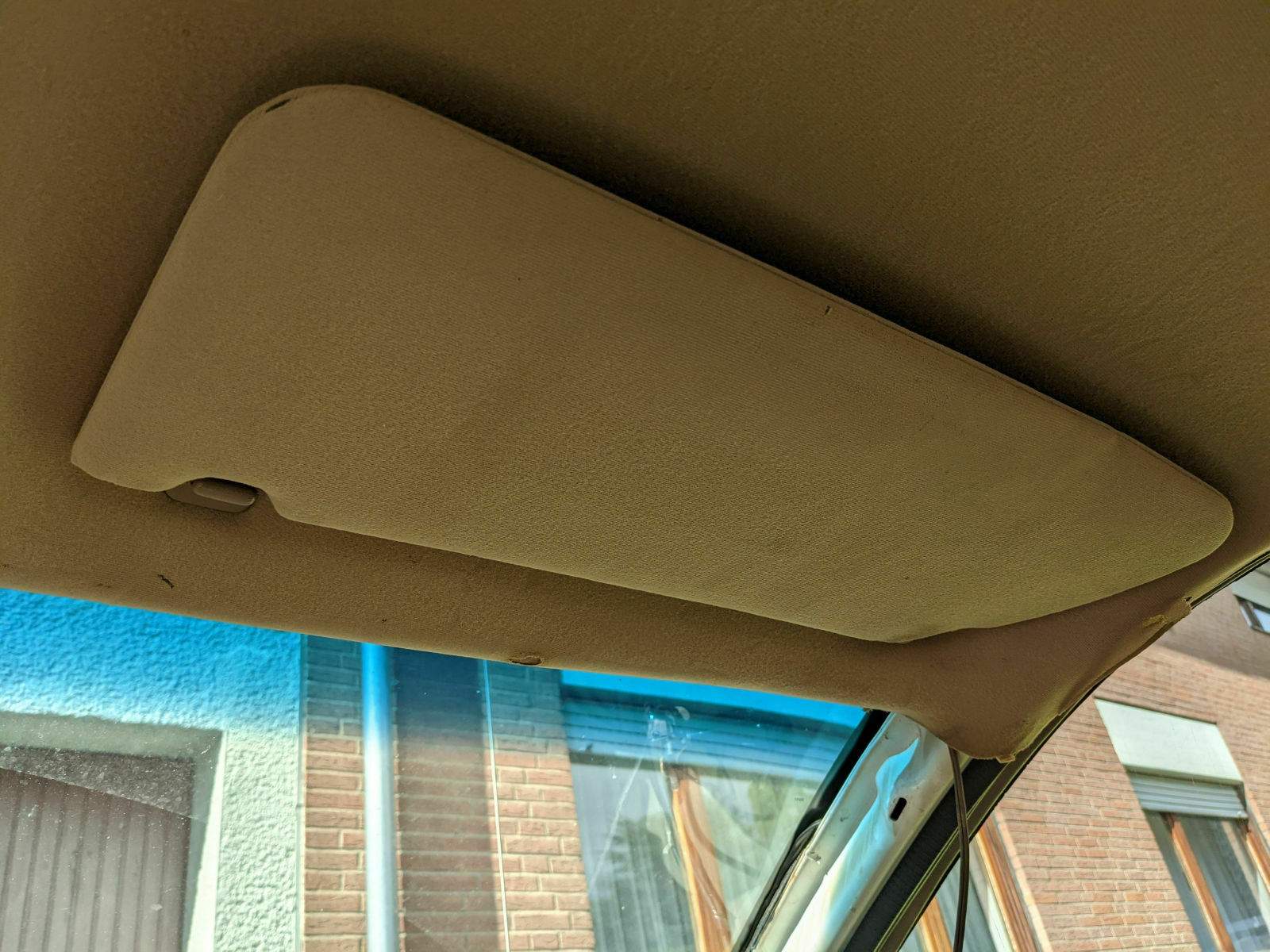 Nachdem der Himmel dann endlich draußen war, bin ich zeitnah beim Sattler vorstellig geworden. Da ich den Himmel nicht transportiert bekomme, muss das Ganze abgeholt werden. Zum Glück haben die einen Transit wo sowas problemlos reinpasst. Bei der Abholung glichen wir noch schnell ein paar Farben ab. Eine kam dem Original schon sehr nahe, allerdings hatte er auch nicht alle Muster dabei. Da wollte er dann in seiner Sattlerei noch einmal checken ob da noch was besseres dabei ist. Davon hängt dann schlussendlich ab was der Spaß unterm Strich kostet. Da gibt es Stoffe die lediglich 20€ pro Meter kosten, es gibt aber auch Stoffe die mal eben 70€ pro laufendem Meter kosten. Er wollte sich so oder so noch einmal melden. Das Grundfazit war aber schon einmal positiv, er sagte das bekommt man hin! Gut drei Tage hatte man für die Arbeit veranschlagt bis alles fertig ist. Neben dem Dachhimmel, bekommen dann auch die Sonnenblenden einen neuen Bezug. Wie man auf den Bildern vielleicht sieht, wurde auf der Fahrerseite schon einmal eine neue Blende montiert. Scheinbar hat man die Alte irgendwie kaputt bekommen. Diese hat aber den falschen Farbton. Damit das Ganze einheitlich wird und der Himmel am Ende nicht drei verschiedene Farben hat, bekommen die Blenden also auch einen neuen Bezug! Mal ganz davon abgesehen das die es auch mal nötig hatten...............