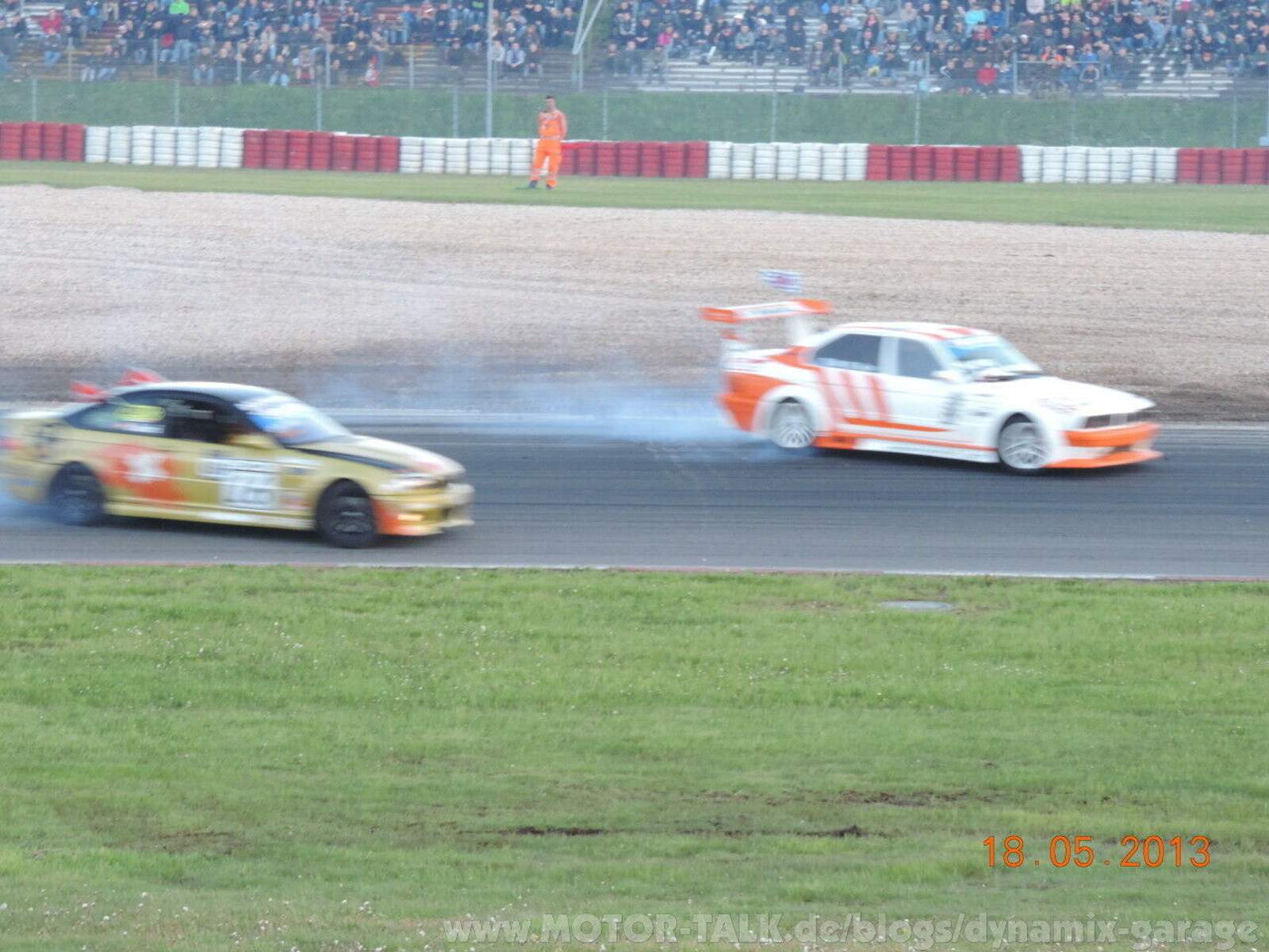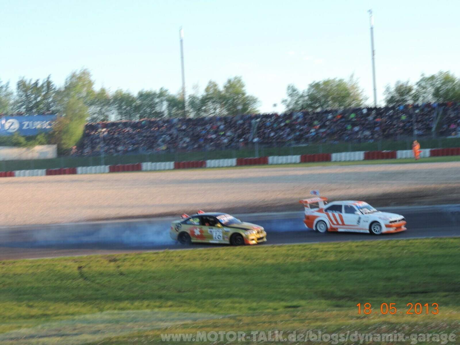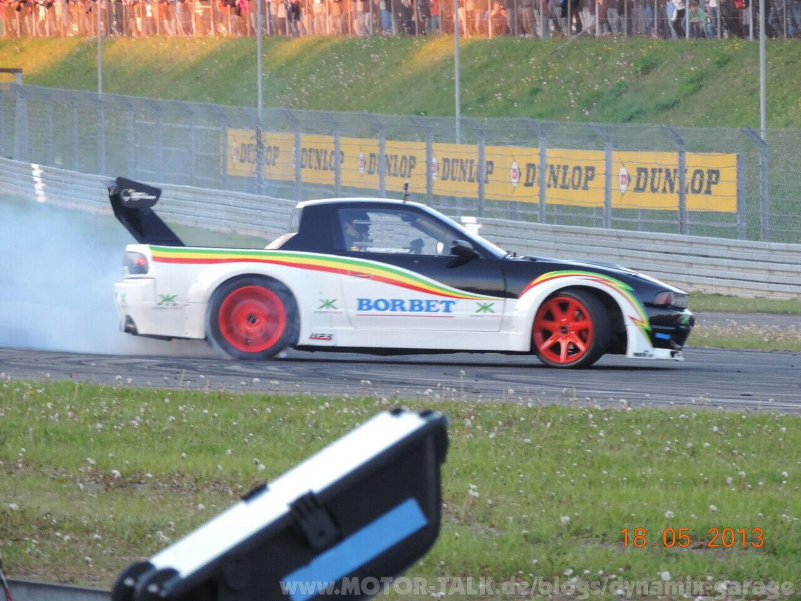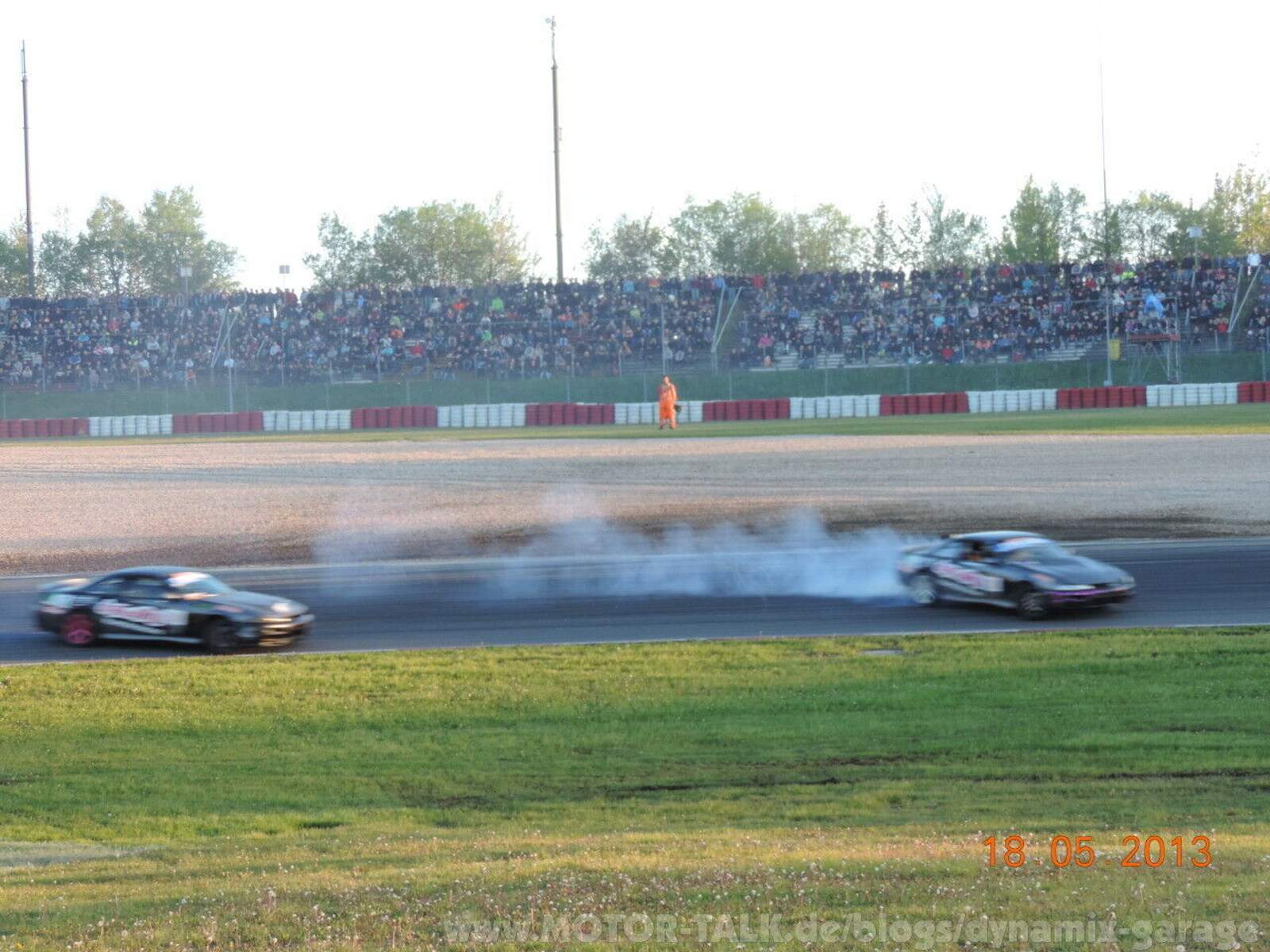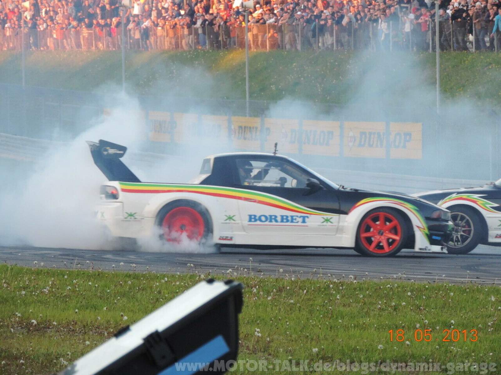 Besonders die Fahrer aus der Falkencrew wollten es offenbar wissen. Unfassbar was die Jungs da für eine Show abgeliefert haben! Querer ging kaum und bei der ganzen Show dürften wohl einige Europaletten Reifen draufgegangen sein. Man merkte das die Autos nicht mehr viel mit der Serie zutun hatten. Zum Einsatz kamen hauptsächlich Fabrikate aus dem Land der aufgehenden Sonne, aber auch die Autos mit dem Propeller kamen bei den Piloten offenbar gut an. Natürlich waren auch noch andere Teams am Start. Die Jungs mit den Borbet Aufklebern (weiß jemand zufällig was das für ein weißer Japan Pick Up war? Japaner mit Ami V8 sind doch schon sehr selten anzutreffen