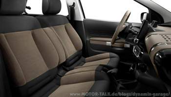 Der Innenraum ist ähnlich flippig gestaltet wie das äußere. Der Tacho ist ein großes Digitaldisplay welches alle nötigen Infos bereithält. Ansonsten ist im Innenraum alles sehr spartanisch. Wo andere Hersteller auf eine dicke Mittelkonsole mit vielen Schaltern, Knöpfen und Drehreglern aufwarten verbaut Citroen das im Konzern mittlerweile oft vorzufindende Touch-Display über das man alle wichtigen Funktionen wie Radio, Navigation, Lüftung etc. pp. bedienen kann. Kann man mögen, muss man aber nicht. Es sieht zwar schick aus aber es lenkt während der Fahrt definitiv mehr ab als ein schnöder Drehregler den man auch blind bedienen kann. Dafür ist der Innenraum dadurch sehr aufgeräumt. Der Clou ist das Armaturenbrett. Beim Cactus hat man den Beifahrerairbag im Dach versteckt weshalb man gleich 2 Handschuhfächer hat. Das eine sitzt ganz herkömmlich im Fußbereich des Fahrers und das zweite sitzt genau da wo normalerweise der Airbag throhnt, mitten auf dem Armaturenbrett. Dadurch hat man viel Platz um Krims-Krams zu verstauen, genau richtig für die moderne Frau von heute