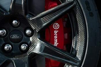So ausgerüstet sollen Tempo 100 nach gut 3,5 Sekunden auf dem Tacho stehen. Die Viertelmeile soll unter 11 Sekunden abgefrühstückt sein. Damit macht der neue GT500 seinen Urahnen alle Ehre die auch schon sehr flott auf der Quarter Mile unterwegs waren. Aber der neue GT500 soll keineswegs ein One-Trick Pony werden. So wie schon Chevrolet beim Camaro ZL1, so mausert sich der GT500 vom reinen Quarter Mile Tool zum ernsthaften Track Racer. Der GT500 soll nämlich künftig auch auf sehr hohem Niveau um die Kurve gehen. Um das zu schaffen haben die Ford Ingenieure dem Mustang ein paar Upgrades verpasst, darunter die größte Serienbremsanlage (laut Ford!) die je an einem nordamerikanischen Sportcoupe verbaut wurde. Die Bremse besteht aus 6-Kolben Sätteln im Verbund mit riesigen 420mm Scheiben an der Vorderachse. Dazu soll man wie beim Camaro ZL1 die Wahl zwischen 2 Paketen haben. Ähnlich dem 1LE Paket bei Chevrolet, so bietet Ford beim GT500 ein Carbon Track Package an welches neben einem großen Spoiler und Splittern auch handgefertigte 20 Zoll Felgen aus Carbon enthält, so wie man Sie schon vom GT350R kennt. Ab Werk wird der Mustang, je nach bestellter Ausführung, auf 2 verschiedenen Reifentypen vom Band rollen die beide auf den Shelby angepasst sind. Währen der "zivile" GT500 auf Michelin Pilot Sport 4S daherkommt, zieht Ford auf die Autos mit Carbon Track Package einen Satz Michelin Pilot Sport Cup 2 auf die exklusiven Carbonräder.