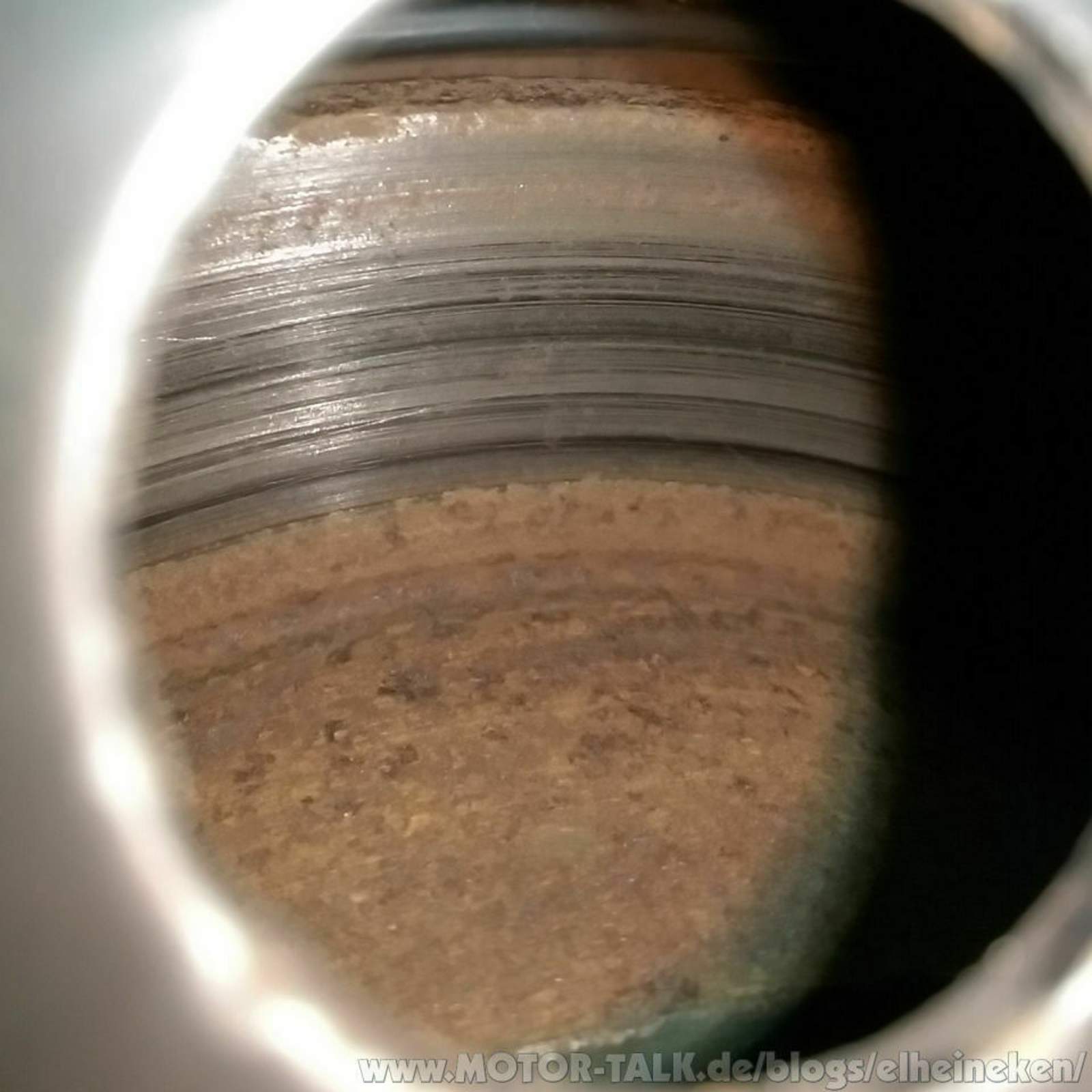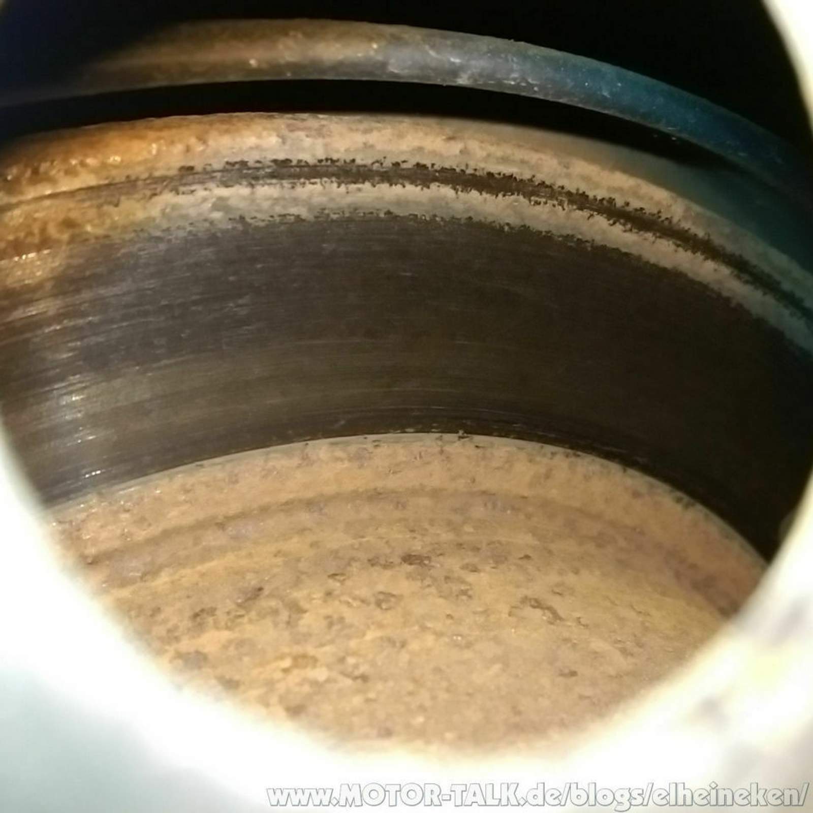 Jetzt also nach etwas mehr als 2000 km wieder einen Blick auf die Bremsscheiben. Hinten eine leicht Verbesserung aber den vom TÜV bemängelten Rostrand gibt es noch immer. Neue Scheiben und Beläge sollte ich wohl schon mal auf die Einkaufsliste setzen.