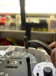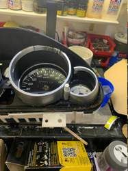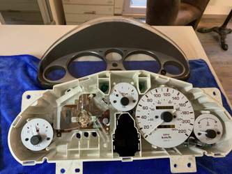 Der Tacho , normal , hmm , ich war mal wieder von einem Zuffenhäuser inspiriert, da sitzt der Tacho in tiefen Ringen , gesagt getan , schnell einen neuern Tacho vom Mazda geholt und zersägt, der alte NA Tacho bleibt aber wegen allen Anzeigen , da wollte ich es mir nicht ganz zu schwer machen. |