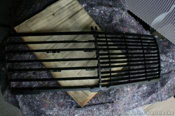 Lange Rede kurzer Sinn; Haube auf, Sägeblatt raus und los. ALLE Vertikalen Linien raus bis auf die in der Mitte. Dann die erste von oben und jede 2te. Damit die Chromleisten bleiben können, aber nur um später lackiert zu werden. Hehe. Nur das sag ich Ihnen nicht.