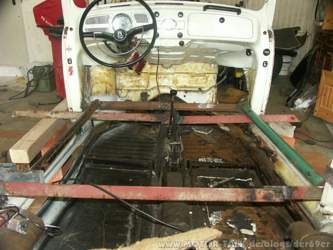 Hallo an alle Das Rahmengestell habe ich eingeschweisst als Sicherheit wenn ich den Warmluftkanal komplett rausschneide. Nicht das hinterher die Türen nicht mehr passen weil die Karosserie verbogen ist. Ansonsten war das Anheben des Aufbaus kein Riesen Problem. Das Problem was ich hatte war den Wagen bzw. den Aufbau so auf Böcke bzw Steine zu stellen das ich ohne Hindernisse am Warmluftkanal arbeiten kann. Dieses hat einige Zeit gekostet und auch einige Nerven, weil der Aufbau mit den Rahmen doch schon recht schwer ist und ich alles alleine mache. Desweiteren sollte er auch stabil stehen weil man ja doch hier und da mal den Dicken Hammer schwingen muss... Ansonsten gehts jetzt mit der Flex zur Sache...... Viele Grüße Mario |