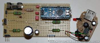 wird das Programm auf den Mikrocontroller übertragen. Nachdem die zwei LEDs RX und TX am Board wieder erloschen sind, kann man das USB Kabel trennen, und alles ins Auto einbauen.