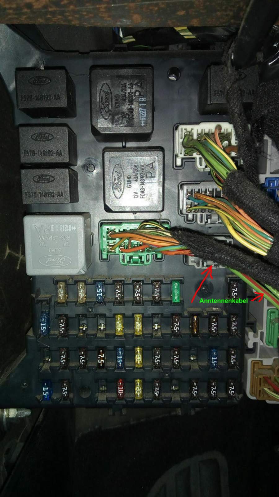 Das Audio System ist ein 6000CD RDS E-O-N was wohl ein Werksradio ist. Leider hat es überhaupt keinen Sender empfang, nur rauschen. Sendersuchlauf läuft bis ich es ausschalte. CD läuft Einwand frei. Nun habe ich gesehen das das Antennenkabel auf der linken Seite A-Säule runter zum Sicherungskasten geht und dann unter dem Teppich zum Radio. Das Radio hat zwei Antennen Stecker ( Bild ), wo zu ? Warum geht es zum Sicherungskasten und hat keine eigene Sicherung ? Hat der Ford einen eigenen Antennenverstärker und wenn ja wo finde ich den ?