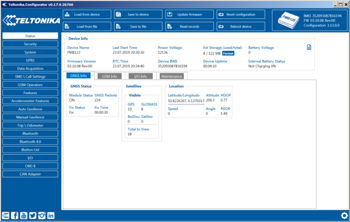 Die Konfiguration der Teltonika-Geräte erfolgt jeweils per USB über ein PC-Tool. Die Einstellmöglichkeiten sind äußerst vielfältig, jedoch muss nur ein kleiner Teil der Parameter für den einfachen Tracking-Betrieb angepasst werden. Das Starten des Motors kann entweder über eine Leitung an Zündungsplus (Klemme 15) oder über die Überwachung der Batteriespannung erkannt werden. Ebenso wie die chinesischen Geräte steht ein Schaltausgang zur Verfügung. Weitere Funktionen sind ein integrierter Beschleunigungssensor, eine integrierte Bluetooth 4.0 Schnittstelle sowie die Auswertung von "iButtons" (RFID-Tags). Optional können zusätzliche externe Sensoren (1-wire Bus) ausgewertet werden. Auch das Mitlesen von CAN-Botschaften bzw. OBD-Diagnose Nachrichten ist möglich. Auch Teltonika bietet die Möglichkeit zur Konfiguration via SMS. Anders als bei den chinesischen Geräten ist die Schnittstelle aber eher für eine automatische Konfiguration durch einen zentralen Server gedacht. Die SMS dient nur dem Anstoßen der Konfiguration und der Übertragung der Server-Adresse, die eigentliche Konfiguration nach dem Anstoßen des Konfig-Vorgangs per TCP/IP Übertragung.