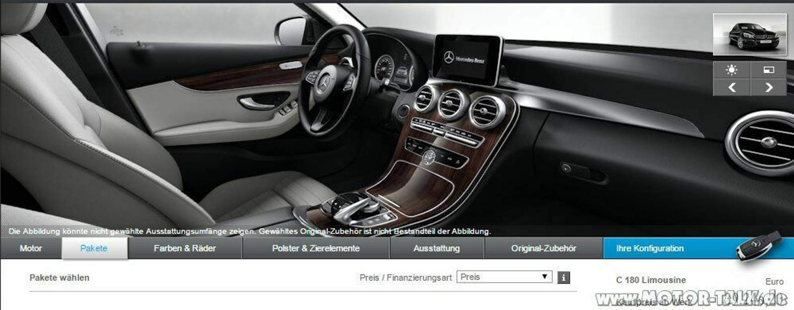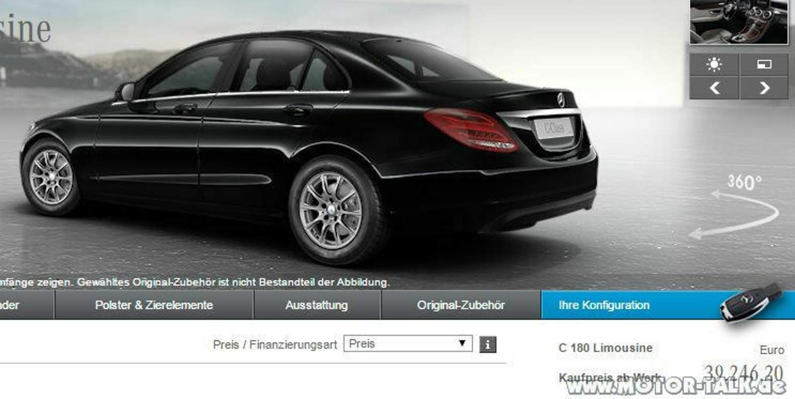 C 180 Limousine 33.706,75 Euro (Basis) schwarz Hubraum 1595 cm³ Leistung 115 kW ( 156 PS ) Beschleunigung 0-100 km/h 8,5 s Höchstgeschwindigkeit 223 km/h Kraftstoffverbrauch kombiniert***: 5,0 l/100 km Rad: LMR 4fach 10-Speichen-Design, 40,6 cm (16'') 595,00 Euro Zierteile: Zierelemente Holz Linde linestructure braun glänzend 404,60 Euro 7G-TRONIC PLUS (Automatik) 2.499,00 Euro LED High Performance-Scheinwerfer 1.029,35 Euro Serienausstattung mit Business-Paket u.a.: Klimatisierungsautomatik THERMATIC mit 1 Klimazone, Sitzheizung für Fahrer und Beifahrer, TEMPOMAT, Direktlenkung, Multifunktionslenkrad, Sitzkomfort-Paket, AGILITY CONTROL Fahrwerk mit selektivem Dämpfungssystem, Touchpad, Radio Audio 20 (inkl. Bluetooth und CD), Kraftstofftank mit größerem Volumen 66 l 39.246,20 |