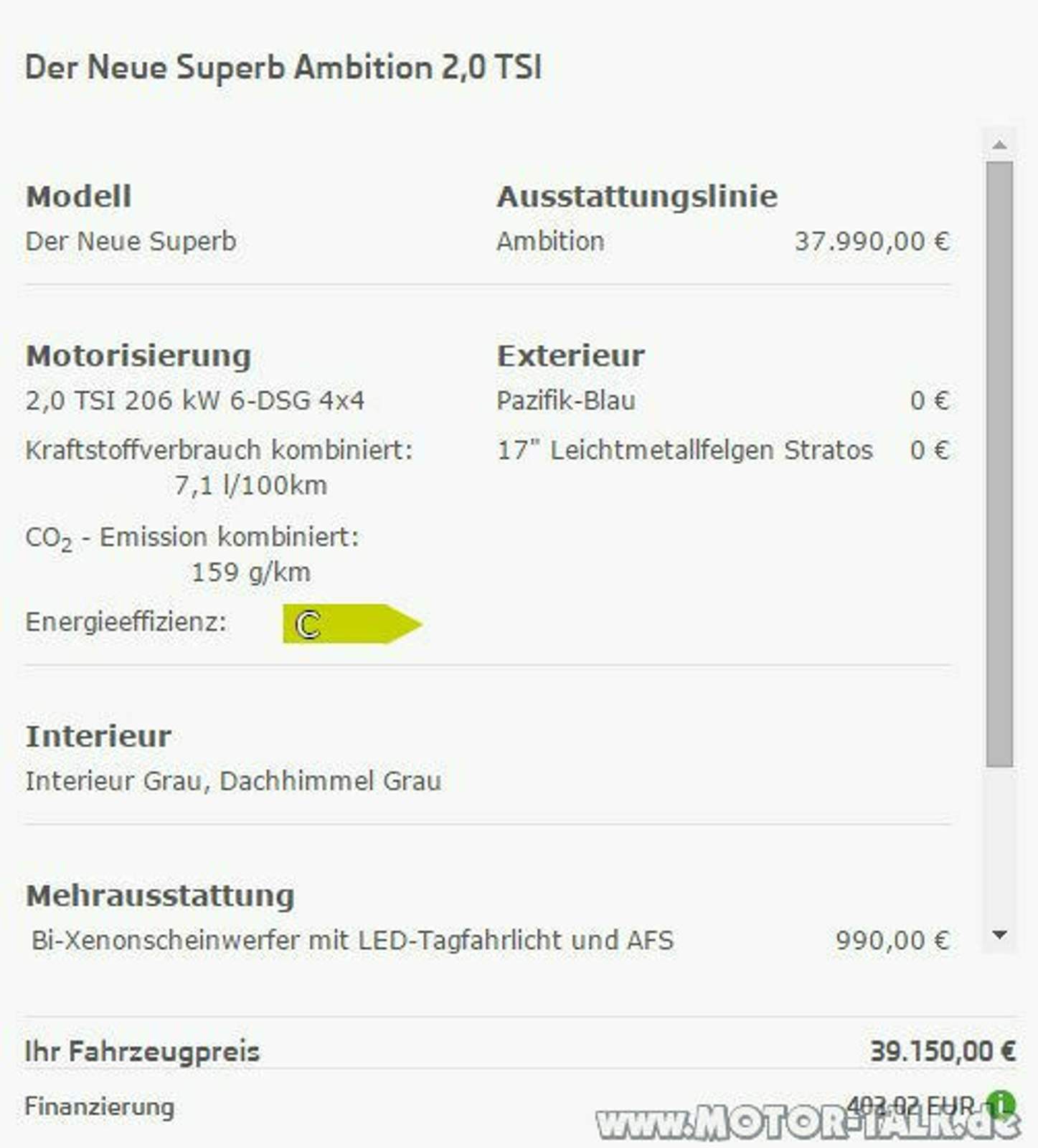 Superb Ambition 2,0 TSI 37.990,00 € (Basis) 2,0 TSI 206 kW 6-DSG 4x4 (Allradantrieb + Automatik/DSG) Kraftstoffverbrauch kombiniert: 7,1 l/100km Höchstgeschwindigkeit 250 km/h Beschleunigung von 0-100 km/h 5,8 s Pazifik-Blau 17" Leichtmetallfelgen Stratos Bi-Xenonscheinwerfer mit LED-Tagfahrlicht und AFS 990,00 € LED-Rückleuchten 170,00 € Serienausstattung Ambition u.a.: Parksensoren hinten, Infotainmentsystem Swing, 8 Lautsprecher, • Klimaanlage Climatronic (2-Zonen), Digitaler Radioempfang DAB+, Geschwindigkeitsregelanlage inklusive Speedlimiter, Nebelscheinwerfer mit Abbiegelicht, Regensensor, Lederlenkrad mit Multifunktionstasten, Schalthebelknauf aus Leder, Dekoreinlage Silber-Brushed, Kraftstoffbehältervolumen 66 l 39.150,00 € http://www.skoda-auto.de/models/superb-neu/overview_2