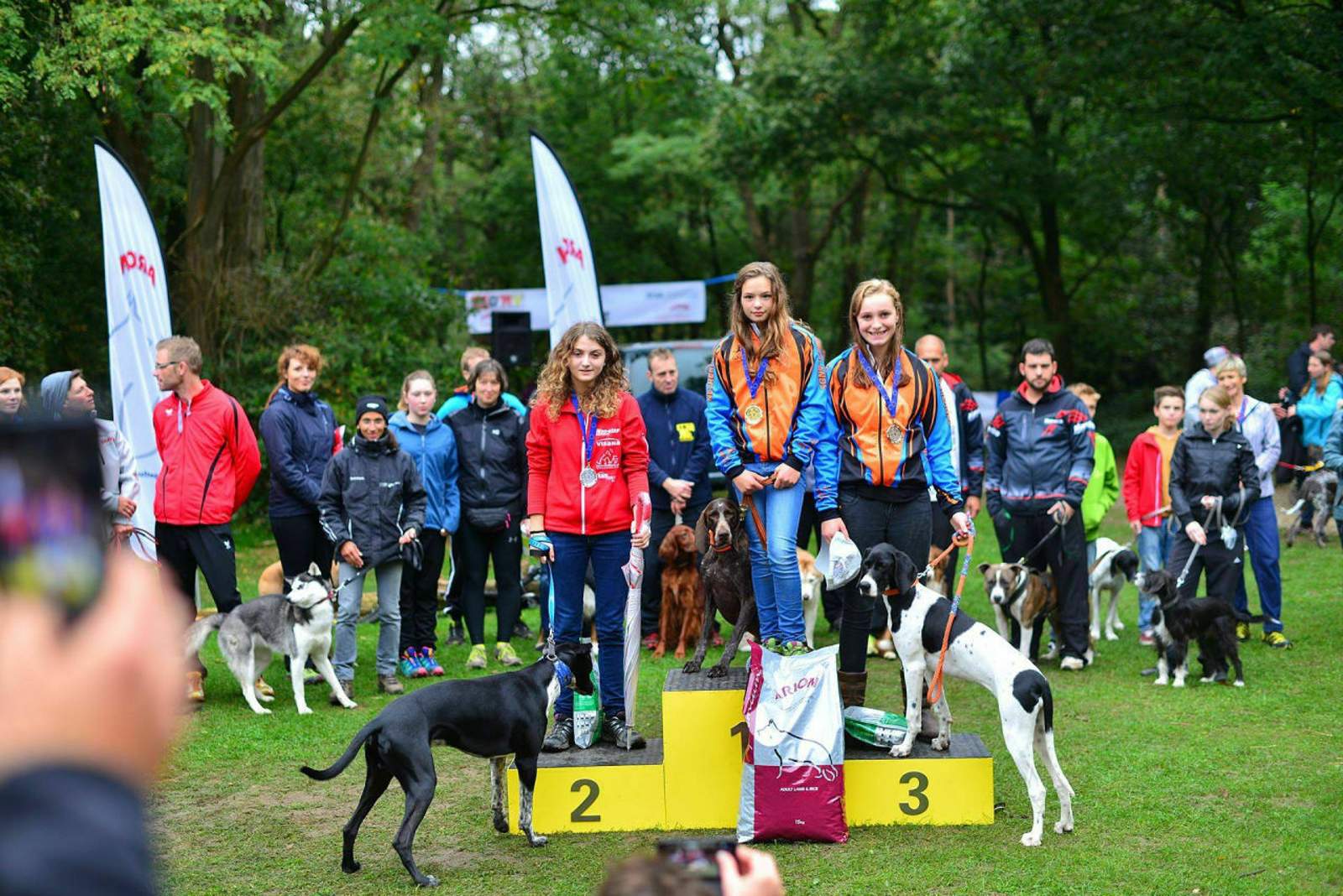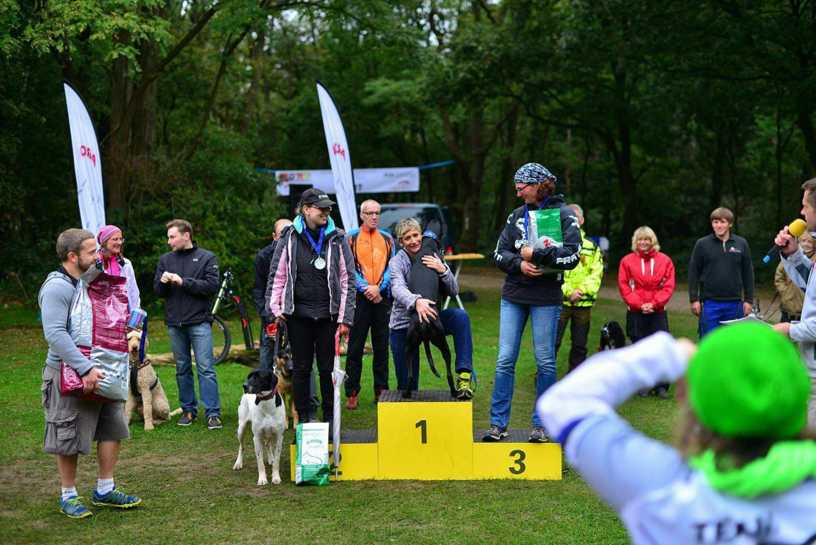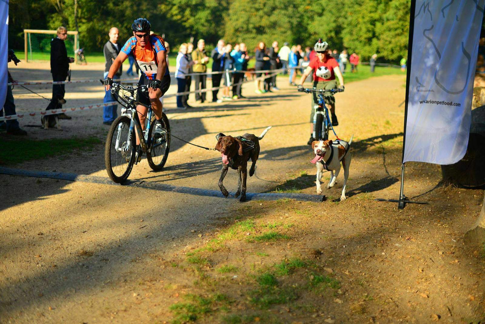 Ich war am Wochenende bei der ersten Tretroller-Cross-Europameisterschaft. Diese hat man zusammengelegt mit dem Arion-Cup 2014, also Hundesport-Rennen. Morgens Arion-Cup, nachmittags Cross-EM. Ich komme ja aus der "normalen" Tretrollerszene (ohne Hund), mag aber Hunde ganz gerne und war doch recht begeistert von der Liebe (*streichel, streichel*) und Freude (*wedel, wedel*) mit den Hunden bei den Rennen. Manche waren beim Start derart heiß, dass sie es kaum abwarten konnten, endlich loszulegen und das Kommando zum Laufen zu bekommen. Besonders die Roller und Räder mit zwei Hunden davor gingen am Start tierisch ab. Beim Arion-Cup gab es verschiedene Starts, also nicht nur mit einem oder 2 Hunden, sondern auch mit Rad (MTB), Tretroller oder zu Fuß (Canicross). Manche Hunde hatten echt Speed. Sogar bergab zogen die derart schnell (zumindest einige schnelle), dass ich mich schon wunderte, dass die Läufer da nicht auf der Nase landeten