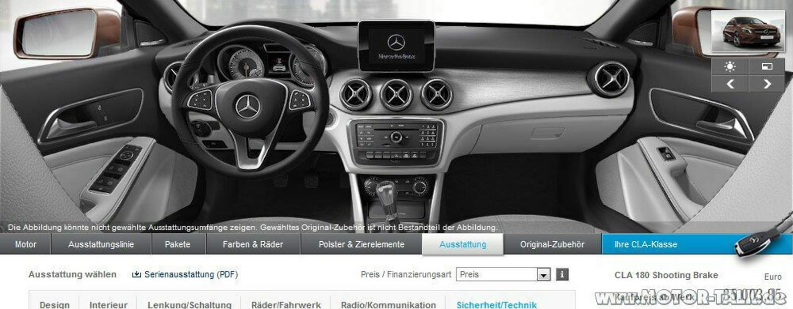 Mercedes CLA 180 Shooting Brake Farbe orientbraun metallic, Aufpreis 761,60 Euro Ausstattungslinie Urban 1.570,80 Euro Harman Kardon® Logic7® Surround-Soundsystem 815,15 Euro Audio 20 CD 59,50 Euro Zierelemente Aluminium mit Längsschliff hell, Aufpreis 178,50 Euro Polster Ledernachbildung ARTICO/Stoff Corumba kristallgrau, ohne Aufpreis Bi-Xenon-Scheinwerfer 1.005,55 Euro Aktiver Park-Assistent 803,25 Euro ------------------------ 35.003,85