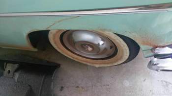 Als es dann Sonntags zu einem kleineren Treffen bzw. zum Tag der offenen Tür einer Werkstatt gehen sollte, gab es eine Überraschung als ich das Garagentor aufmachte. Irgendwas stimmte nicht, der Olds hing vorne links etwas runter. Leider steht der Wagen mit der Linken Seite ziemlich nahe an der Wand aber als ich mich kurz auf den Boden legte um nachzusehen was da los war, fand ich den Fehler recht schnell -> Reifen platt
