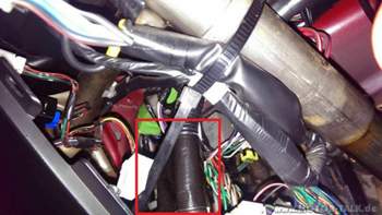 Das Relais sitzt im Fahrerfussraum recht weit hinten (Links von der Lenkstange). Auf dem ersten Bild sieht man es gut (grün umrandet). Eigentlich sollte man es direkt finden. Ich schreibe extra "eigentlich" weil bei mir nur die Haltevorrichtung für das Relais zu sehen war aber kein Relais. Ich dachte dass es Modellabhängig evtl wo anders ist, aber als ich dann vom dicken Kabelstrang einfach mal allen Leitungen gefolgt bin habe ich gesehen dass der Vorbesitzer das Relais mit schwarzem Gewebeband an den schwarzen kabelstrang geklebt hat. Ich habs einfach nicht gesehen.