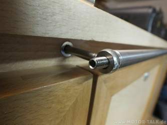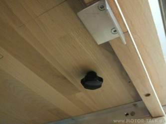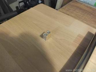 Deshalb konnte ich noch die Lösung für den Tisch angehen und ihn auch fertig machen. Die Größe ist 50x 80cm, damit man auch zu zweit genügend Platz zum Essen hat. So steht die Platte ca. 10 cm über die Bank. Ich hatte noch eine alte Kleiderstange gefunden, die geteilt die richtige Länge für die Beine hatte. Zwei Stecksockel, eine übrige Gewindestange und die schon erwähnten Aluprofile und schon ist der Tisch fertig. Da wackelt oder kippelt nichts.