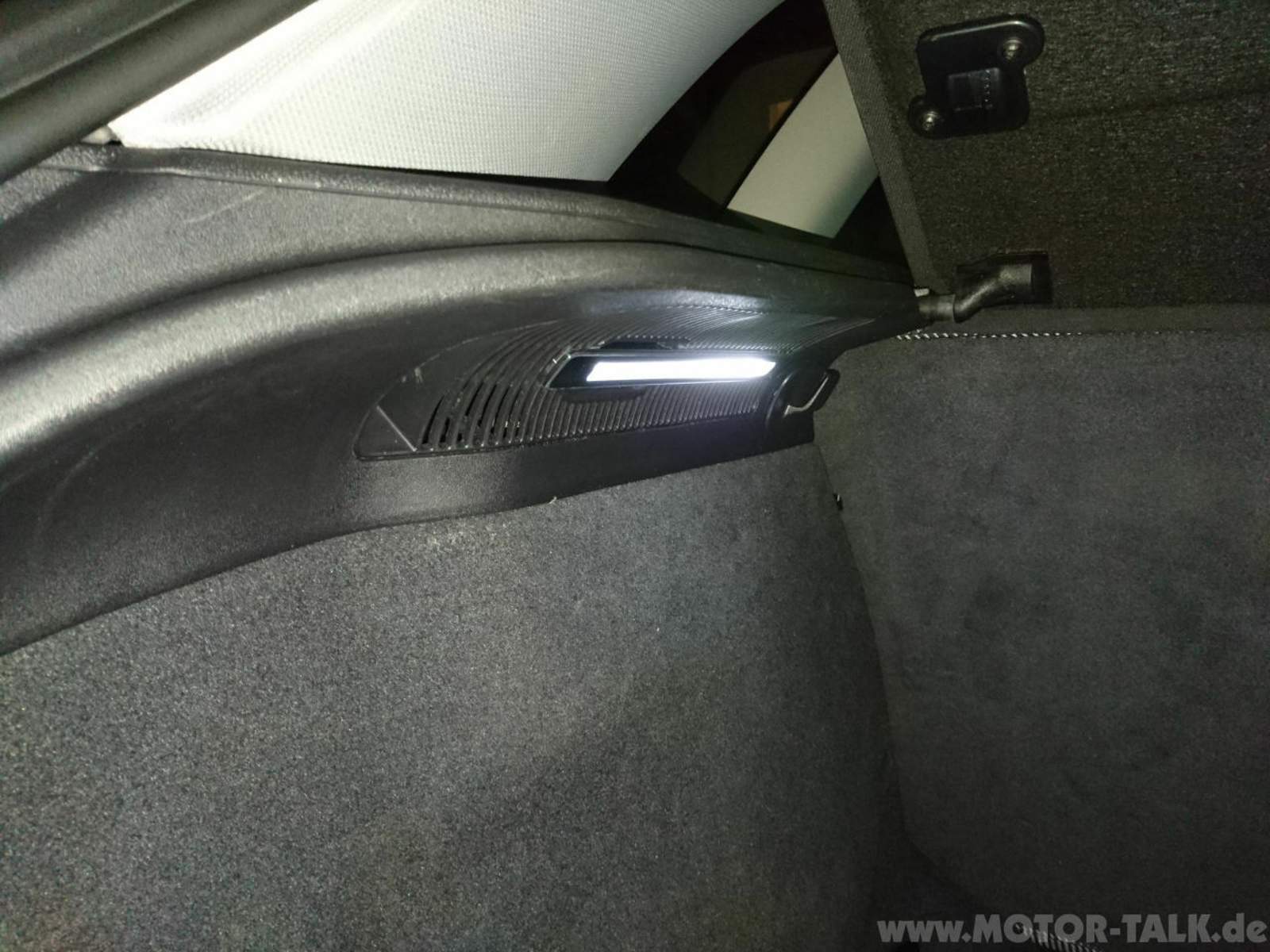 4 - Kabel an die Kabel der bestehenden Leuchte anschließen und verlegen. Für die rechte Leuchte bin ich unter der mittleren Abdeckung an einem bestehendem Kabelbaum entlang. Um da hin zu kommen ohne das Kabel am Subwofer befestigen zu müssen (dachte mir das klappert dann vielleicht) gerade von der linken Leuchte runter auf den Kofferraumboden verlegen und dann am linken Rand des Bodens nach hinten zum bestehenden Kabelbaum rüber zur rechten Seite. Danach entlang weiterer bestehender Verkabelungen hoch zur neuen Leuchte.